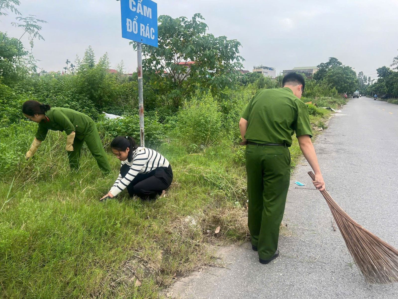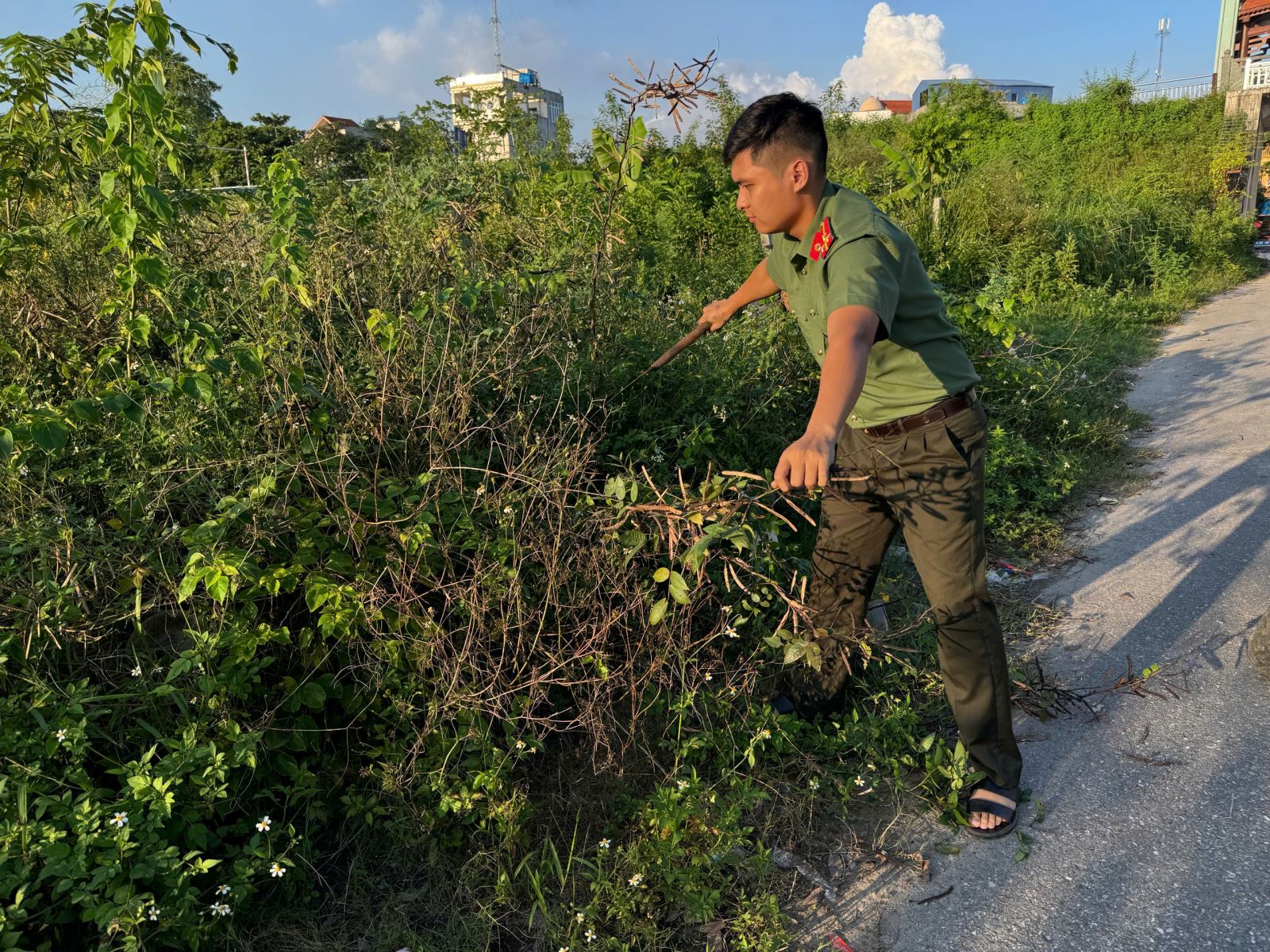 Hình ảnh dọn dẹp vệ sinh cắt tỉa hàng cây của Chi đoàn Thanh niên và Hội phụ nữ Công an phường