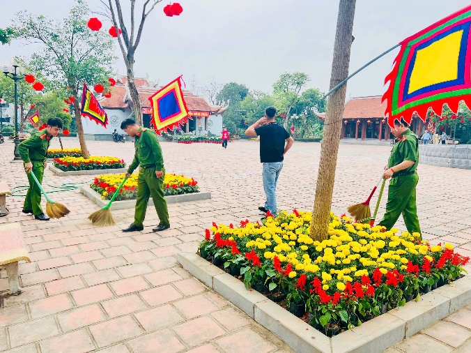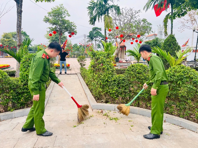 Đoàn viên chi đoàn Công an xã dọn dẹp vệ sinh môi trường tại khu vực Đền thờ Đức vua Triệu Việt Vương