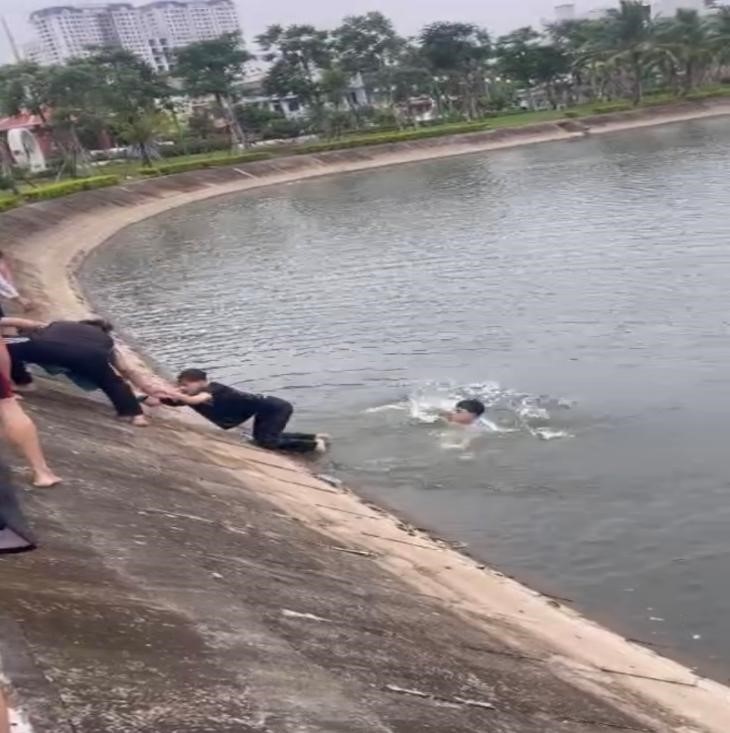 Đồng chí Mai Đức Long lao xuống hồ kịp thời cứu và đưa cháu bé lên bờ an toàn