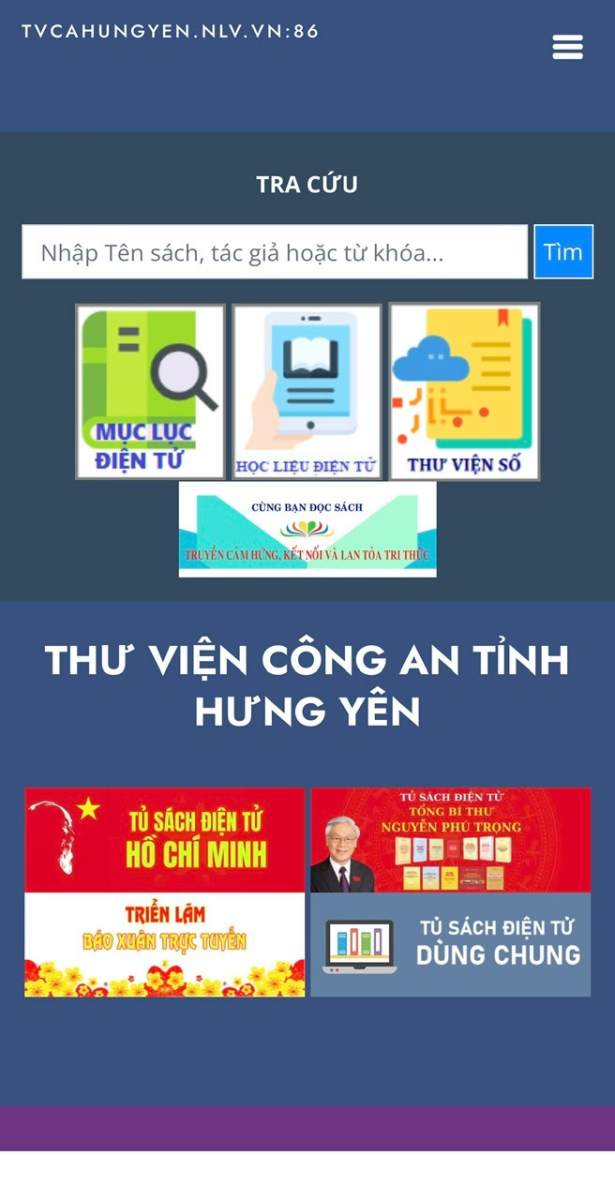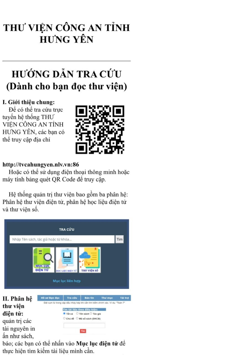 Phần mềm VietBiblio cho phép tra cứu mục lục trực tuyến, quản lý học liệu số, tự động hóa kiểm kê và bảo trì tài liệu. Để có thể tra cứu trực tuyến hệ thống Thư viện Công an tỉnh, cán bộ chiến sĩ chỉ cần truy cập địa chỉ http://tvcahungyen.nlv.vn:86/. Hoặc có thể sử dụng điện thoại thông minh, máy tính bảng quét QR Code để truy cập. Hệ thống quản trị thư viện bao gồm ba phân hệ: Phân hệ thư viện điện tử, phân hệ học liệu điện tử và thư viện số. Với chức năng tìm kiếm đơn giản bạn có thể nhập các thông tin như tên sách, tác giả, chủ đề, năm xuất bản để tìm kiếm. Với chức năng tìm kiếm nâng cao bạn có kết hợp các điểm truy cập như tên sách, chủ đề, năm xuất bản để giới hạn kết quả tìm kiếm. Sau khi có kết quả tìm kiếm bạn có thể lấy số đăng ký cá biệt mang đến thủ thư phục vụ cho bạn. Hoặc bạn có thể lấy sách trực tiếp mang đến thủ thư để thực hiện mượn tài liệu.