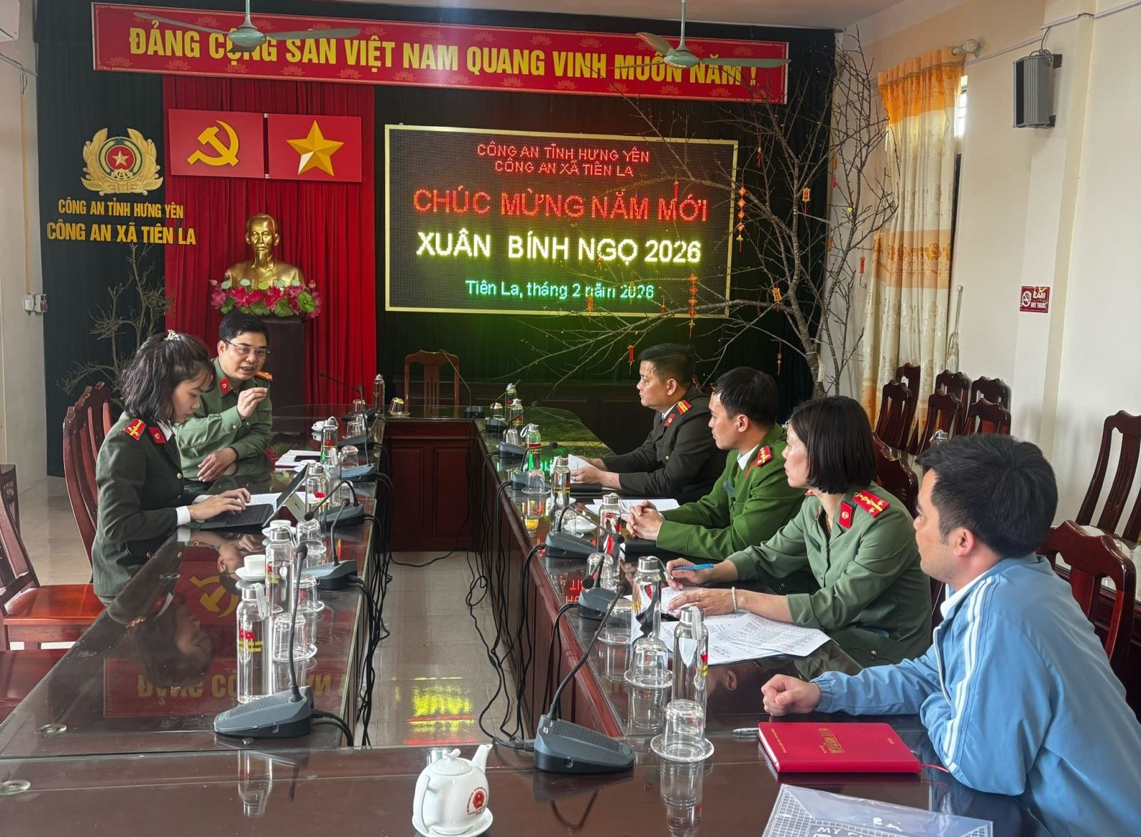 Các thành viên nhóm nghiên cứu đề tài làm việc với đại diện cấp ủy Công an 2 xã Vạn Xuân và Tiên La
