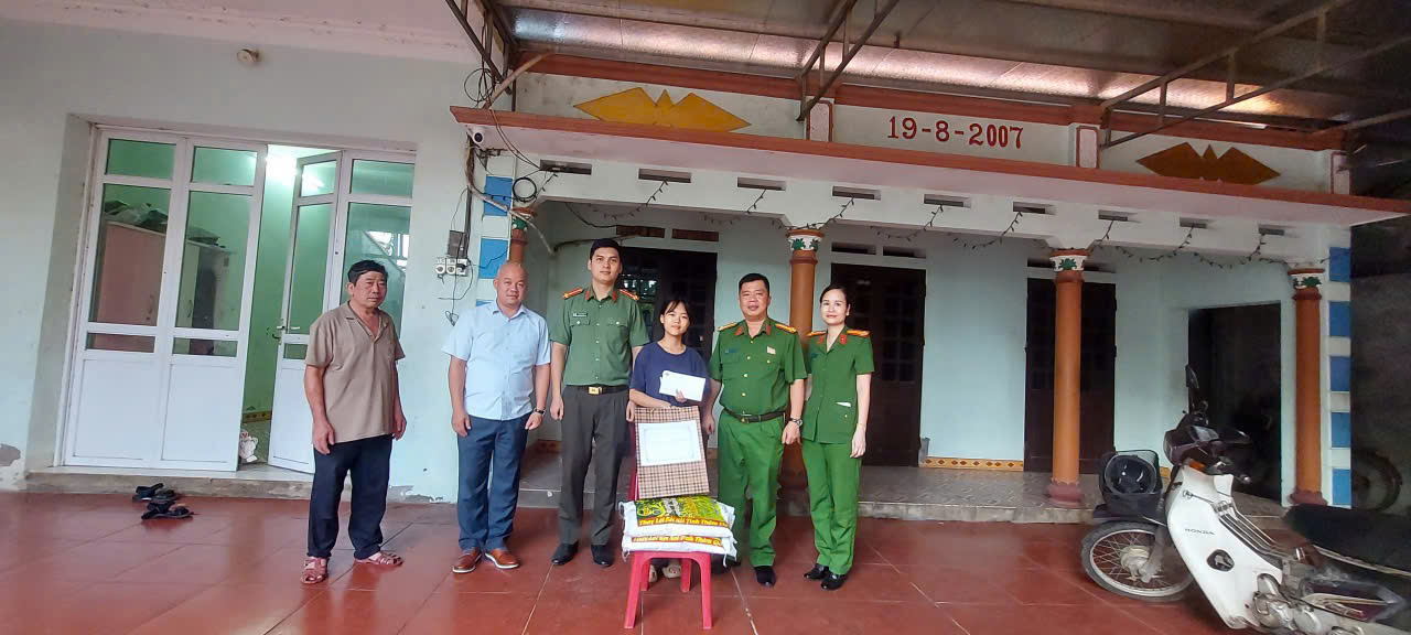 Đồng chí Lãnh đạo Công an phường tặng quà, ân cần hỏi thăm và động viên Kiều Anh cố gắng vươn lên trong học tập