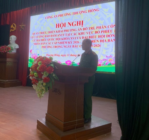Tại Hội nghị Đồng chí Trung tá Ngô Quang Hải - Phó Trưởng Công an phường Thượng Hồng thông qua nội dung phương án bố trí, phân công lực lượng bảo đảm an ninh, trật tự tại các khu vực bỏ phiếu bầu cử đại biểu Quốc hội khóa XVI và đại biểu HĐND các cấp nhiệm kỳ 2026-2031 trên địa bàn phường Thượng Hồng trong Ngày bầu cử 15/3/2026. Sau đó đồng chí Thượng tá Nguyễn Đức Sơn Trưởng Công an phường đã chỉ đạo, quán triệt các nội dung trọng tâm, các vấn đề cần lưu ý đối với cán bộ chiến sỹ trong quá trình thực hiện nhiệm vụ đảm bảo An ninh trật tự trong Ngày bầu cử tại các khu vực bỏ phiếu đã được phân công.