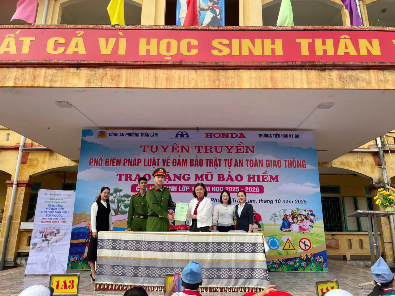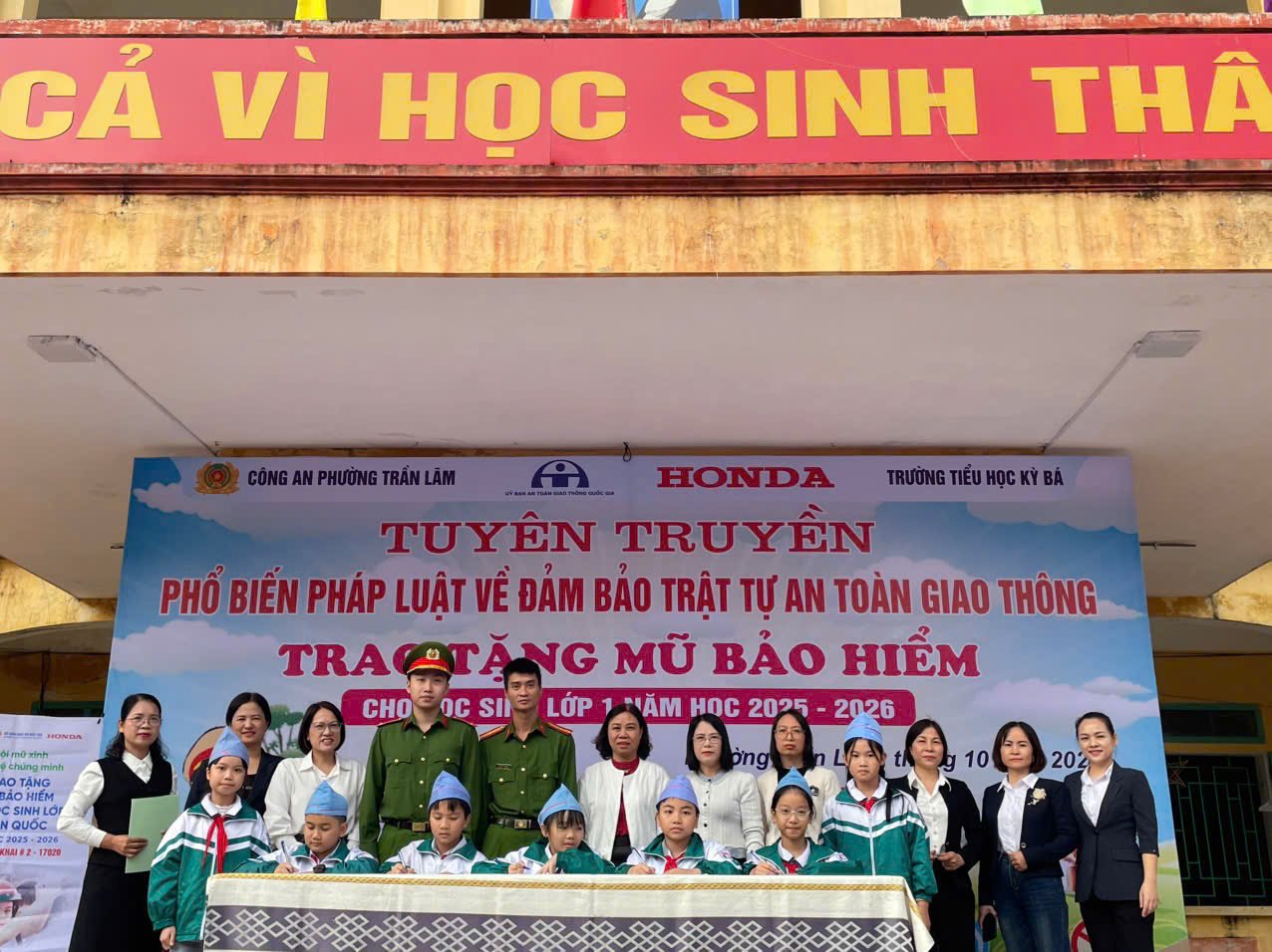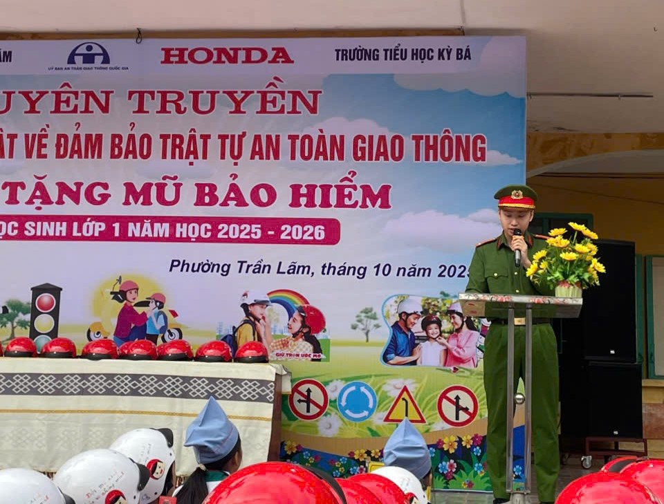 Thực hiện kế hoạch công tác phổ biến, giáo dục về trật tự an toàn giao thông năm 2025, sáng ngày 27/10/2025, Công an phường Trần Lãm phối hợp với Trường Tiểu học Kỳ Bá và Công ty Honda Việt Nam – chi nhánh Minh Khai tổ chức chương trình “Tuyên truyền phổ biến pháp luật về trật tự an toàn giao thông, trao tặng mũ bảo hiểm cho học sinh lớp 1 năm học 2025 – 2026”.