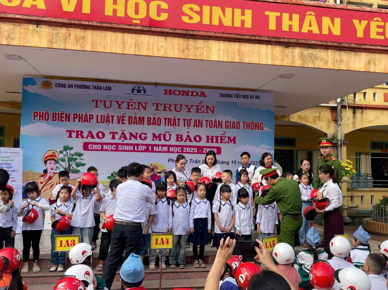 Công an phường Trần Lãm, Công ty Honda trao nón bảo hiểm cho học sinh lớp 1 – Trưởng tiểu học Kỳ Bá.