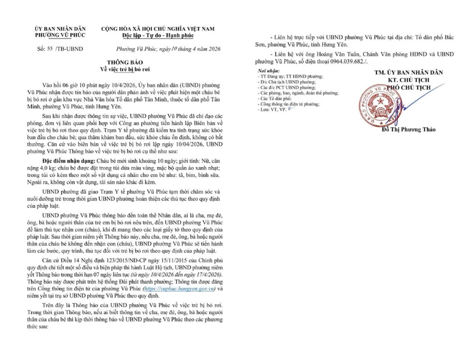 Trước đó, vào khoảng 06h10 ngày 10/4/2026, Công an phường Vũ Phúc nhận được tin báo của người dân về việc một cháu bé bị bỏ rơi gần khu vực Nhà Văn hoá Tổ dân phố Tân Minh, phường Vũ Phúc, tỉnh Hưng Yên. Ngay sau khi tiếp nhận thông tin, Công an phường Vũ Phúc đã phối hợp với các đơn vị liên quan tiến hành lập Biên bản về việc trẻ bị bỏ rơi theo quy định. Trạm Y tế phường đã kiểm tra tình trạng ban đầu của cháu bé; qua thăm khám sức khoẻ cháu bé ổn định, không có bất thường. Cháu bé được Trạm Y tế phường tạm thời chăm sóc và nuôi dưỡng trong thời gian UBND phường tiếp tục hoàn thiện các thủ tục theo quy định của Pháp luật.