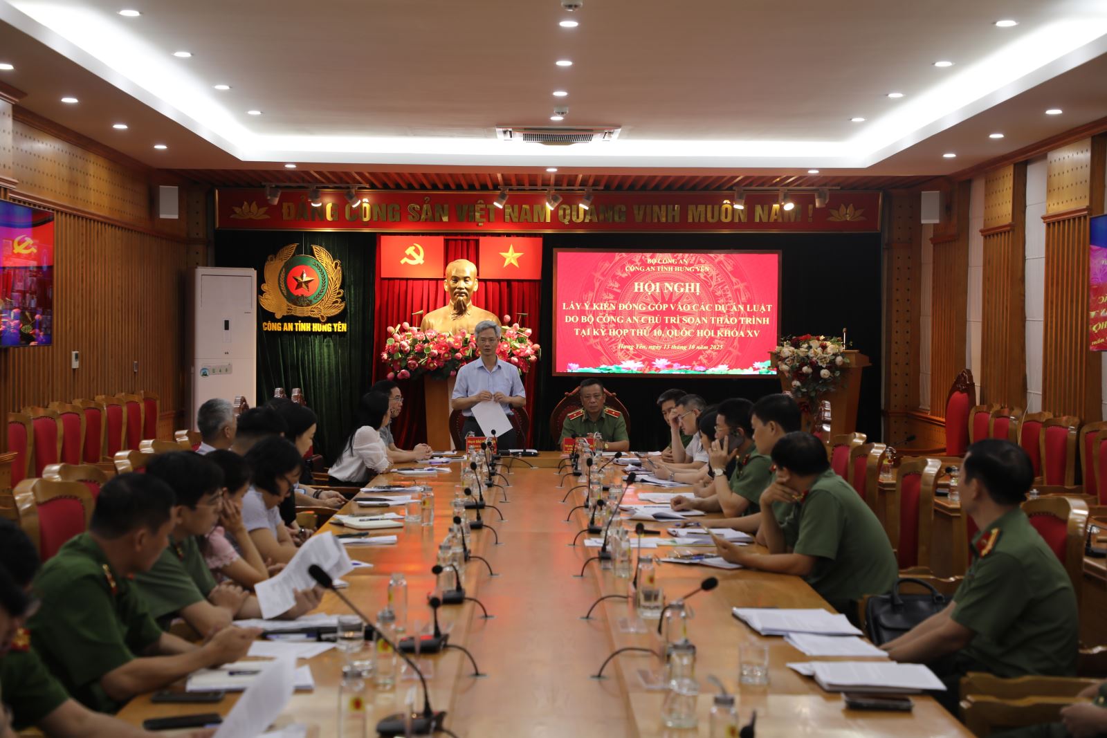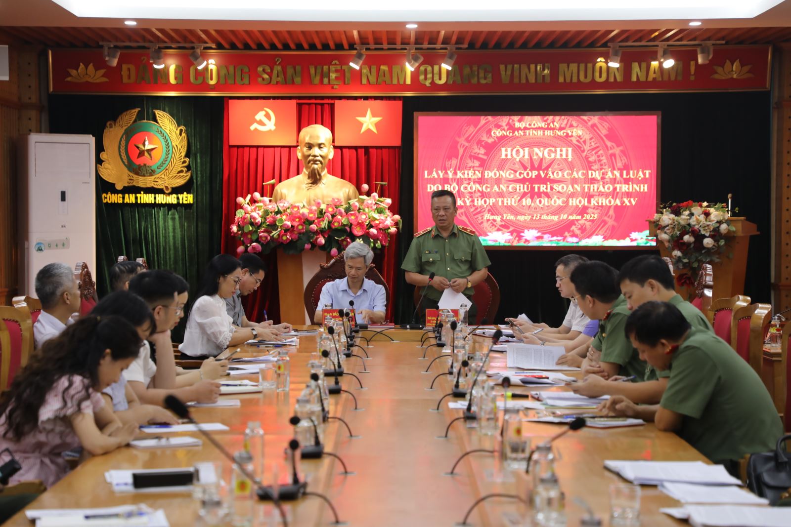 Chiều ngày 13/10/2025, Công an tỉnh Hưng Yên tổ chức Hội nghị lấy ý kiến xây dựng các dự án luật do Bộ Công an chủ trì soạn thảo trình Quốc hội khóa XV, kỳ họp thứ 10. Đồng chí Đào Hồng Vận - Ủy viên Ban Thường vụ Tỉnh ủy, Trưởng Đoàn Đại biểu Quốc hội tỉnh, Giám đốc Sở Nội vụ và đồng chí Thiếu tướng Trần Xuân Ánh - Ủy viên Ban Thường vụ Tỉnh ủy, Giám đốc Công an tỉnh đồng chủ trì Hội nghị.