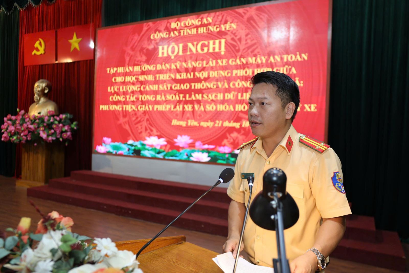Ngày 21/10/2025, Công an tỉnh Hưng Yên tổ chức hội nghị tập huấn, hướng dẫn kỹ năng lái xe gắn máy an toàn cho học sinh và triển khai nội dung phối hợp giữa lực lượng Cảnh sát giao thông với Công an cấp xã trong công tác đảm bảo trật tự an toàn giao thông. Đồng chí Đại tá Vũ Trung Thành - Phó Giám đốc Công an tỉnh dự và phát biểu chỉ đạo.