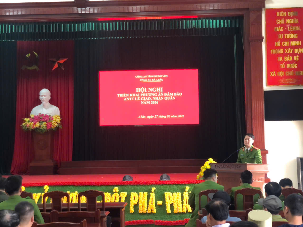Ngày 27/02/2026, Công an xã A Sào tổ chức Hội nghị triển khai Phương án đảm bảo an ninh, trật tự nhằm bảo đảm tuyệt đối an ninh, an toàn Lễ giao, nhận quân năm 2026 diễn ra tại khu vực di tích lịch sử văn hóa quốc gia Đình - Đền – Bến tượng A Sào. Hội nghị có sự tham dự của cán bộ, chiến sĩ Công an xã và các lực lượng liên quan, thể hiện tinh thần chủ động, trách nhiệm cao trong thực hiện nhiệm vụ chính trị trọng tâm của địa phương.