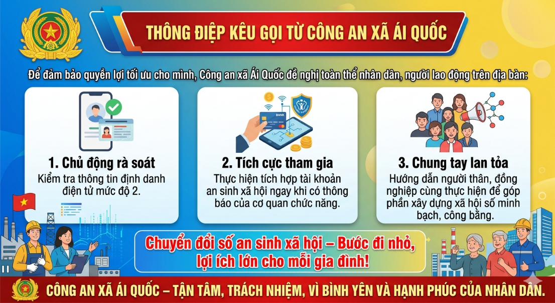 Để đảm bảo quyền lợi tối ưu cho mình, Công an xã Ái Quốc đề nghị toàn thể nhân dân, người lao động trên địa bàn: Chủ động rà soát, kiểm tra thông tin định danh điện tử mức độ 2; Thực hiện tích hợp tài khoản an sinh xã hội ngay khi có thông báo của cơ quan chức năng; Tích cực hỗ trợ, hướng dẫn người thân, đồng nghiệp cùng thực hiện để góp phần xây dựng xã hội số minh bạch, công bằng. Thời gian tới, Công an xã Ái Quốc sẽ huy động tối đa lực lượng, tiếp tục hỗ trợ Nhân dân trên địa bàn xã tích hợp tài khoản hưởng an sinh xã hội.