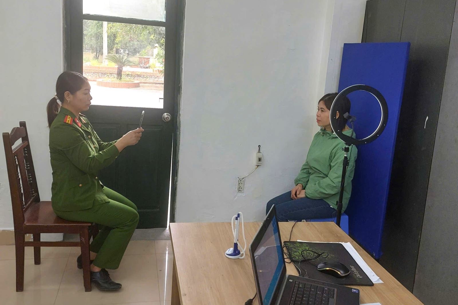 Đồng chí Thiếu tá Ngô Thị Yến - Công an xã Ân Thi tiếp nhận hồ sơ, chụp ảnh cấp đổi giấy phép lái xe cho người dân.