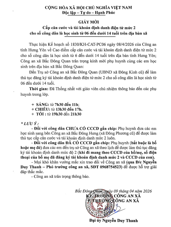 Nhằm triển khai Kế hoạch của Công an tỉnh, Công an xã đã tham mưu Ủy ban nhân dân (UBND) xã ban hành Kế hoạch số 35/KH-UBND, ngày 10/4/2026 về việc mở đợt cao điểm cấp căn cước và tài khoản định danh điện tử mức 2 cho học sinh từ đủ 6 đến dưới 14 tuổi trên địa bàn xã. Công an xã đã gửi giấy mời tới các nhà trường để thống nhất thời gian thực hiện, thông qua giáo viên chủ nhiệm, Công an xã thông tin đến phụ huynh học sinh về thời gian thực hiện cụ thể.