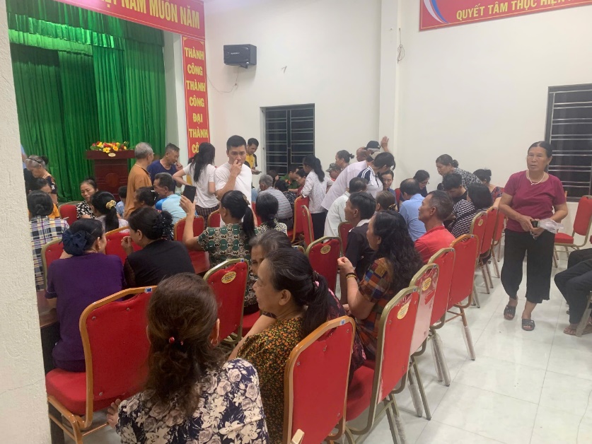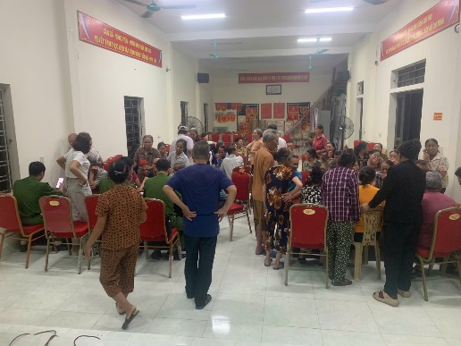 Bà con nhân dân hồ hởi đến nhà Văn hoá thôn để được hướng dẫn tích hợp tài khoản an sinh xã hội trên VNeiID