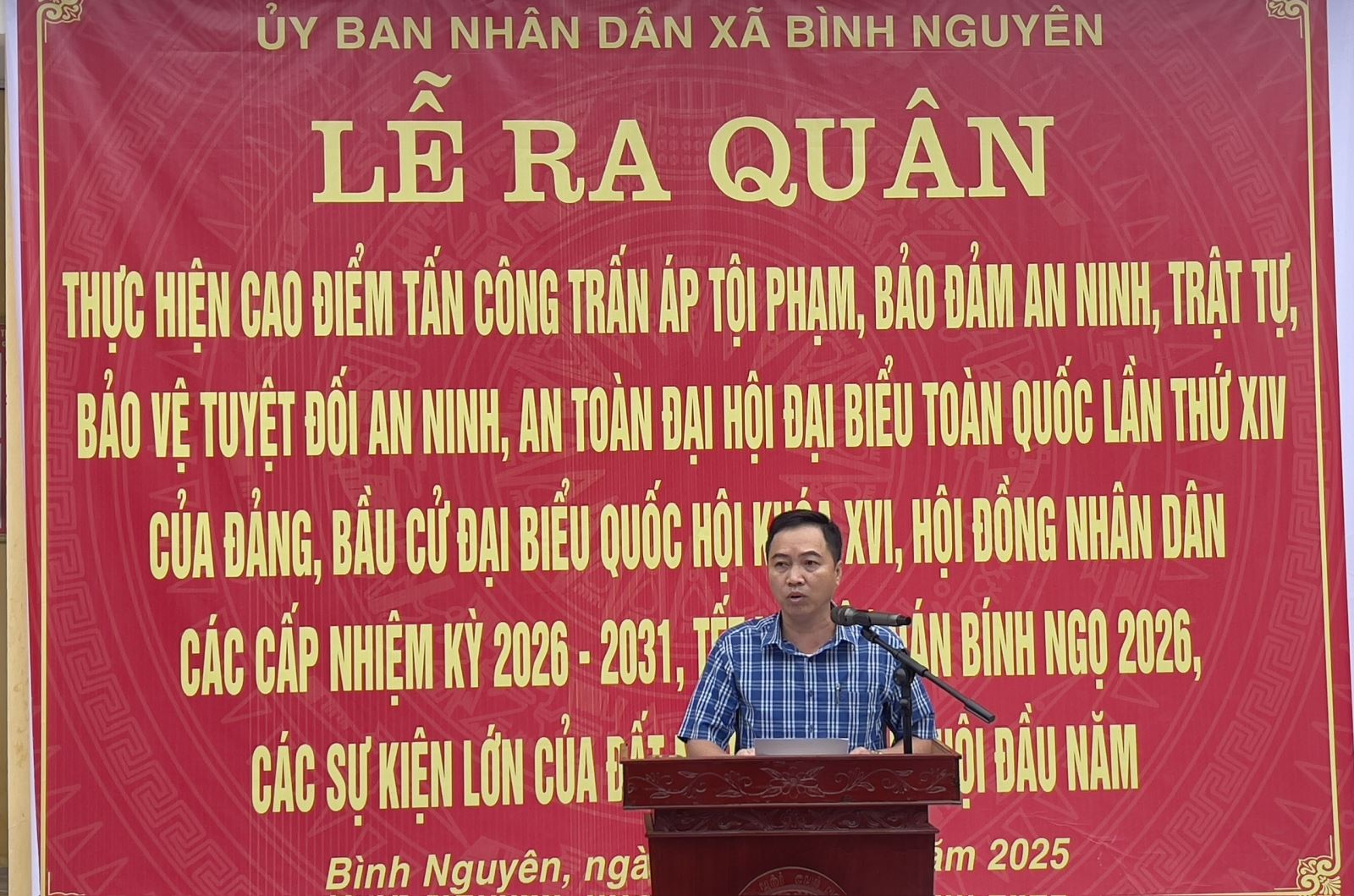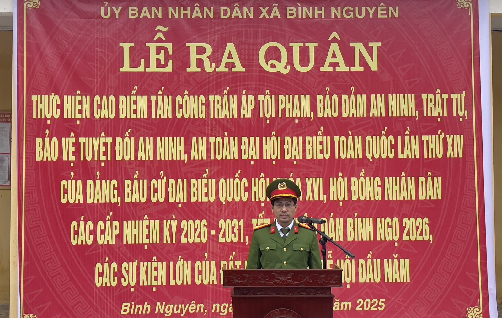 Sáng ngày 12/12/2025, Công an xã Bình Nguyên đã tổ chức Lễ ra quân thực hiện đợt cao điểm tấn công trấn áp tội phạm, đảm bảo an ninh, trật tự, bảo vệ tuyệt đối an ninh, an toàn Đại hội đại biểu toàn quốc lần thứ XIV của Đảng, bầu cử đại biểu Quốc hội khóa XVI, Hội đồng nhân dân các cấp nhiệm kỳ 2026 – 2031, Tết Nguyên đán Bính Ngọ 2026, các sự kiện lớn của đất nước và các lễ hội đầu năm. Dự buổi lễ có các đồng chí: Nguyễn Văn Đạt – Bí thư Đảng ủy, Chủ tịch Hội đồng nhân dân xã; Trần Quang Hưng - Đảng ủy viên, Phó Chủ tịch UBND xã; Thượng tá Lê Đức Hải – Trưởng Công an xã; các đồng chí trong Ban thường vụ Đảng ủy, lãnh đạo HĐND, UBND xã.