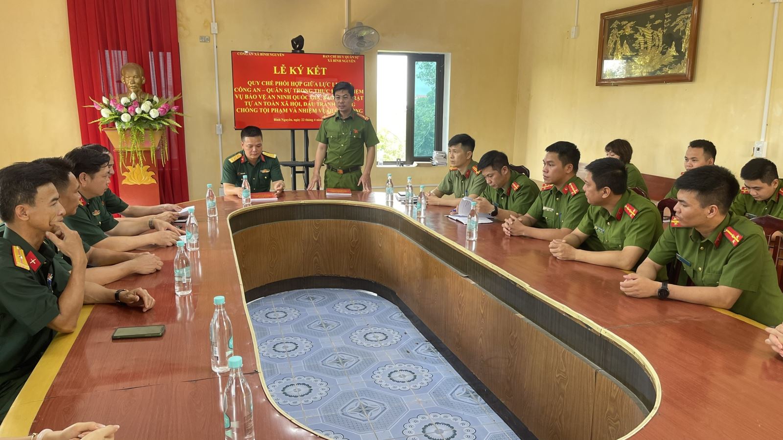 Tại buổi Lễ, đồng chí Thượng tá Lê Đức Hải, Trưởng Công an xã đã báo cáo quá trình xây dựng và thông qua nội dung Quy chế phối hợp giữa lực lượng Công an xã, Ban Chỉ huy Quân sự xã. Theo đó, nội dung thực hiện Quy chế gồm: Phối hợp trao đổi thông tin và kiểm tra, xác minh thông tin; công tác vận động quần chúng; phối hợp trong công tác giáo dục quốc phòng và an ninh; phối hợp trong đấu tranh phòng, chống tội phạm; phối hợp trong thực hiện nhiệm vụ phòng, chống tụ tập đông người trái pháp luật, biểu tình gây rối an ninh trật tự, bạo loạn, khủng bố; phối hợp bảo vệ chủ quyền quốc gia, quản lý vùng trời và an ninh không gian mạng; phối hợp trong công tác quản lý hành chính về ngành, nghề kinh doanh có điều kiện về an ninh, trật tự; quản lý, sử dụng vũ khí, vật liệu nổ và công cụ hỗ trợ; ứng phó sự cố thiên tai và tìm kiếm cứu nạn; Phối hợp bảo vệ các sự kiện chính trị, văn hóa, xã hội quan trọng của Đảng, Nhà nước, của tỉnh và của xã; các hội nghị quốc tế tổ chức tại địa bàn xã; phối hợp xây dựng và bảo vệ lực lượng; phối hợp trong công tác huấn luyện, đào tạo và tổ chức diễn tập; phối hợp trong phòng thủ dân sự; phối hợp khi thực hiện Nghị quyết, Lệnh ban bố tình trạng khẩn cấp về an ninh quốc gia, trật tự, an toàn xã hội và quốc phòng; phối hợp giải quyết các vụ việc có yếu tố nước ngoài.