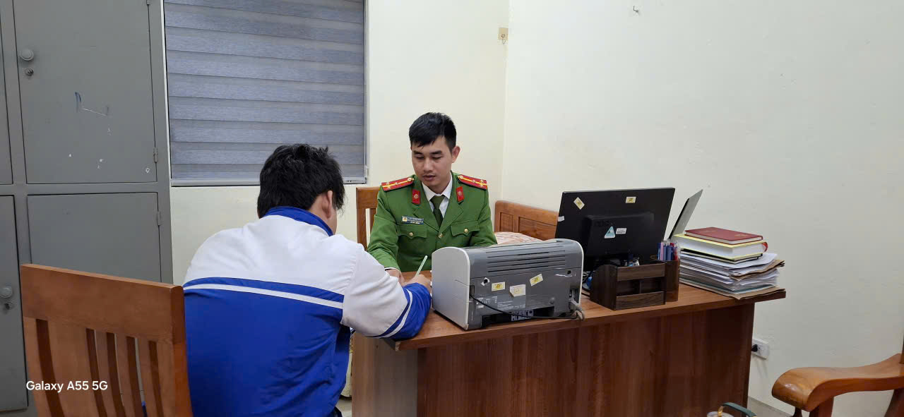 Công an xã Diên Hà làm việc với các công dân đăng tải, chia sẻ thông tin xấu độc trên không gian mạng tại trụ sở Công an xã