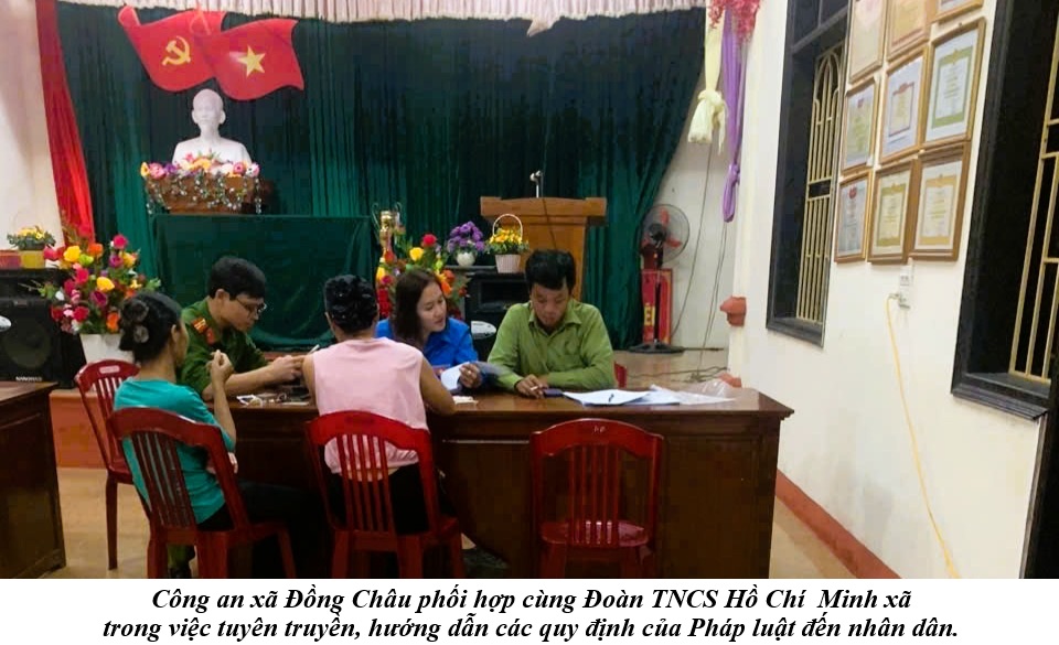 Công an xã Đồng Châu đồng thời phát huy vai trò nòng cốt, phối hợp chặt chẽ với Ban Chỉ đạo 35 xã, Ban Chỉ huy Quân sự xã, Ủy ban Mặt trận Tổ quốc Việt Nam xã và các tổ chức đoàn thể như Hội Nông dân, Hội Liên hiệp Phụ nữ, Hội Cựu chiến binh, Đoàn Thanh niên trong công tác tuyên truyền, nắm bắt tình hình tư tưởng, dư luận xã hội; kịp thời trao đổi, xử lý các thông tin xấu độc, sai sự thật phát sinh trên địa bàn và không gian mạng.