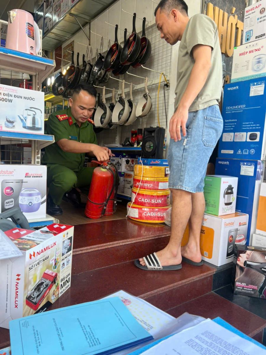 Cán bộ Công an xã hướng dẫn cơ sở cách sử dụng bình chữa cháy và kiểm tra hoạt động của hệ thống chuông báo cháy