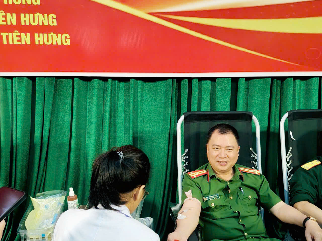 Đồng chí Thượng tá Phạm Minh Thư, Trưởng Công an xã tham gia hiến máu tình nguyện
