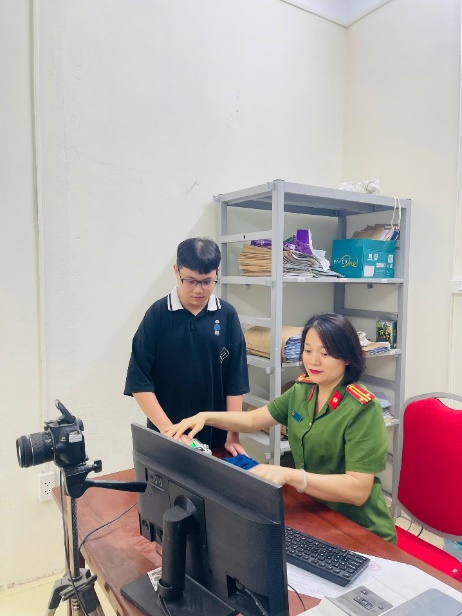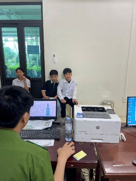 Cán bộ Công an xã tiến hành thu nhận hồ sơ căn cước, tài khoản định danh điện tử mức 2 cho học sinh từ 6 đến dưới 14 tuổi