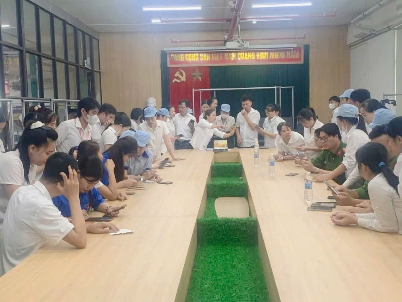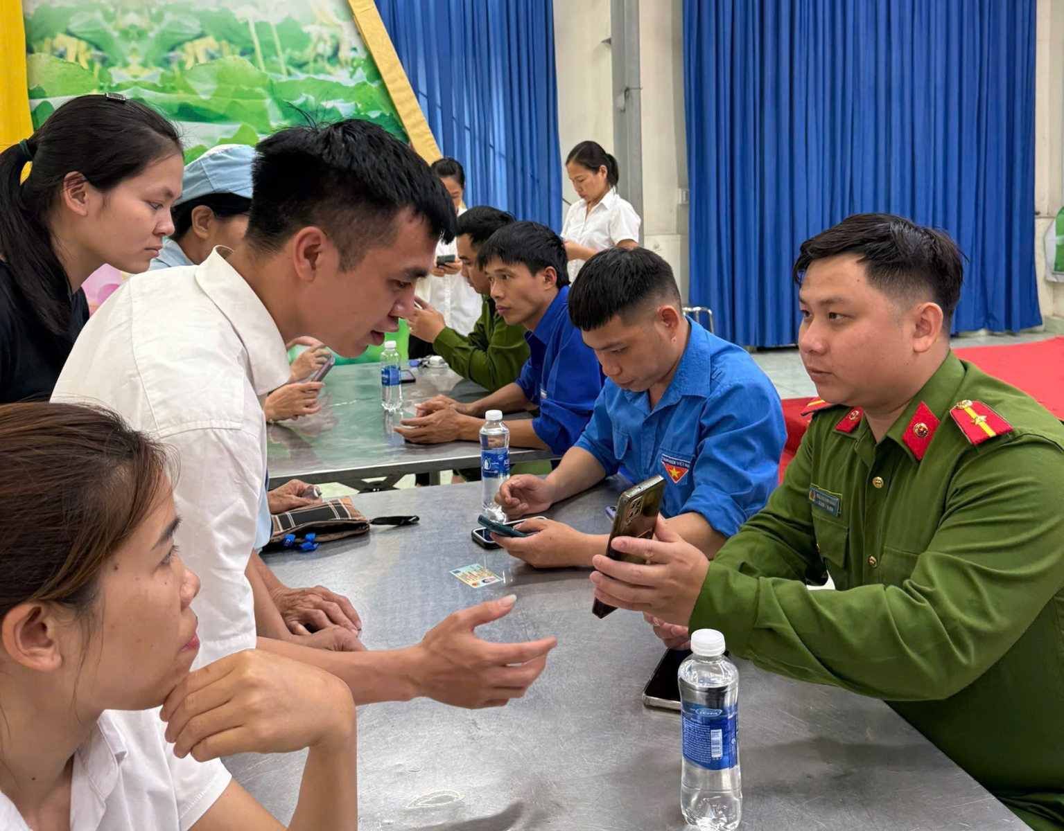 Công an xã phối hợp với Đoàn thanh niên hướng dẫn công nhân trong các doanh nghiệp đăng ký tài khoản an sinh xã hội trên ứng dụng VneID
