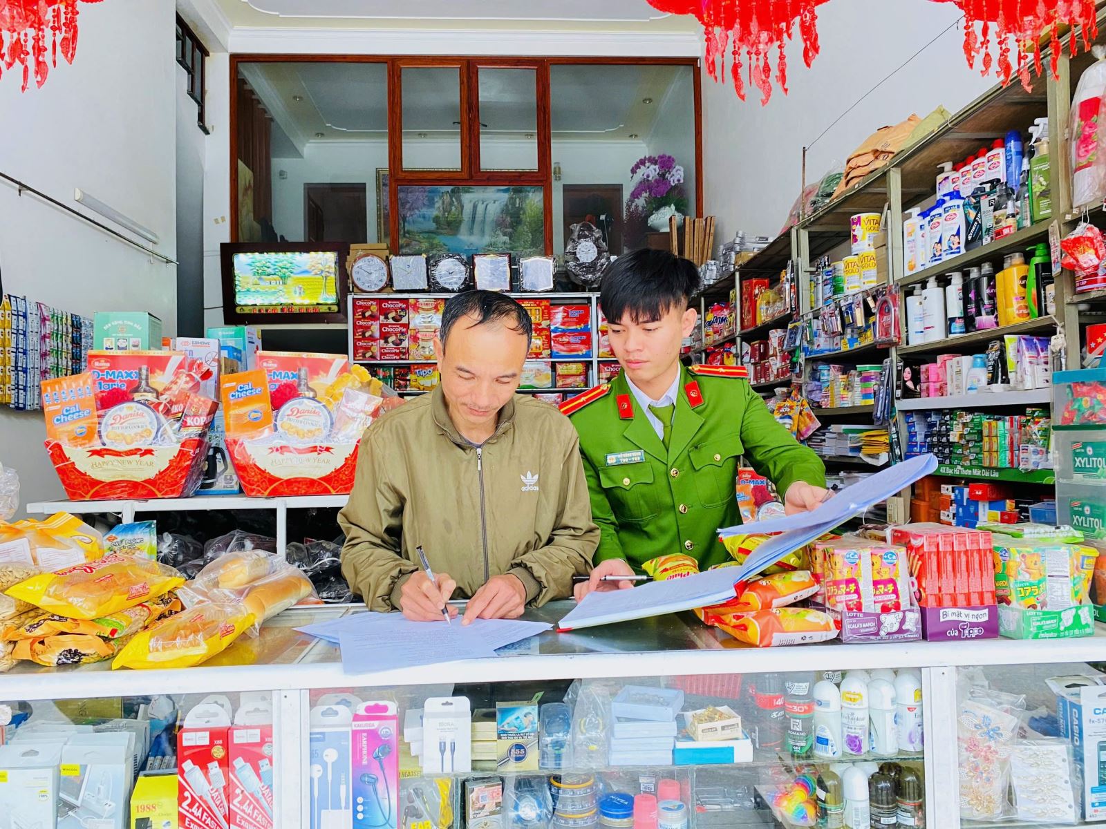 Công an xã Lê Lợi tổ chức tuyên truyền, ký cam kết tại các hộ kinh doanh trên địa bàn