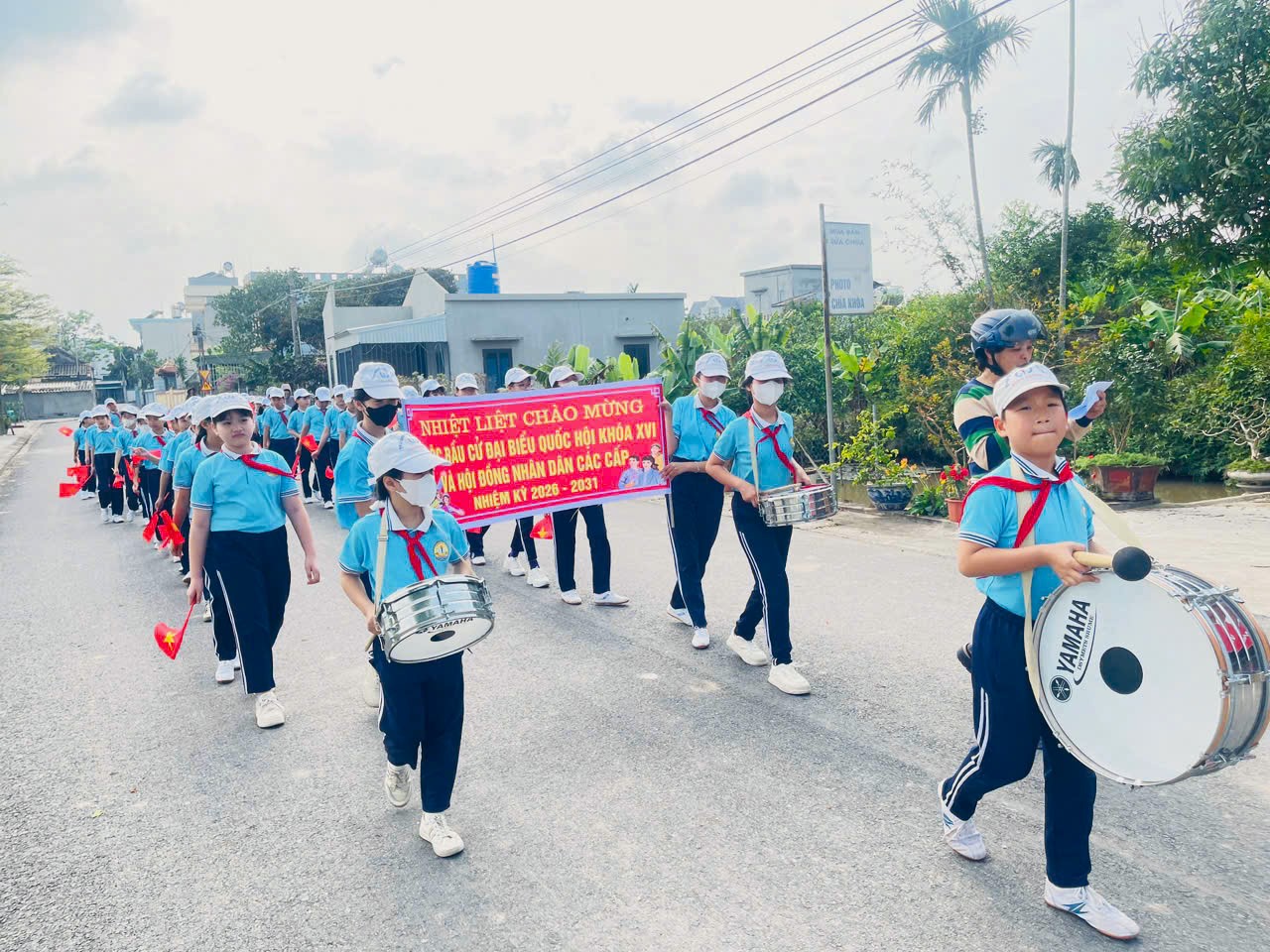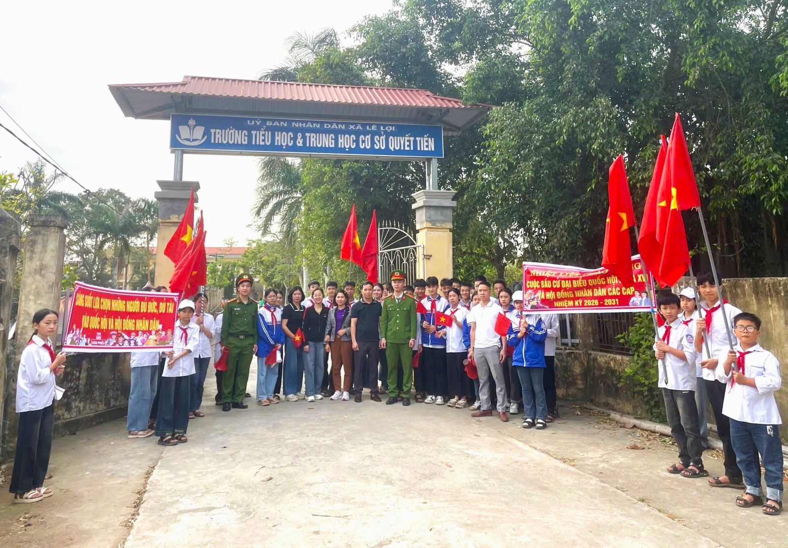 Chương trình tuyên truyền được tổ chức với quy mô trang trọng và khí thế. Dưới sự phối hợp của Công an xã, Đoàn Thanh niên xã và Ban giám hiệu nhà trường, đông đảo đoàn viên thanh niên, giáo viên cùng các em học sinh đã tham gia hoạt động cổ động trực quan bằng hình thức diễu hành, mang theo cờ Tổ quốc, băng rôn, khẩu hiệu tuyên truyền về bầu cử. Những hàng cờ đỏ sao vàng rực rỡ, tiếng trống rộn ràng cùng các khẩu hiệu tuyên truyền nổi bật đã tạo nên bầu không khí sôi nổi trên các tuyến đường của địa phương. Hình ảnh các em học sinh trong trang phục chỉnh tề, tay cầm cờ Tổ quốc, hăng hái tham gia diễu hành không chỉ thể hiện tinh thần trách nhiệm của thế hệ trẻ mà còn góp phần lan tỏa mạnh mẽ thông điệp về quyền và nghĩa vụ thiêng liêng của mỗi công dân trong việc tham gia bầu cử.
