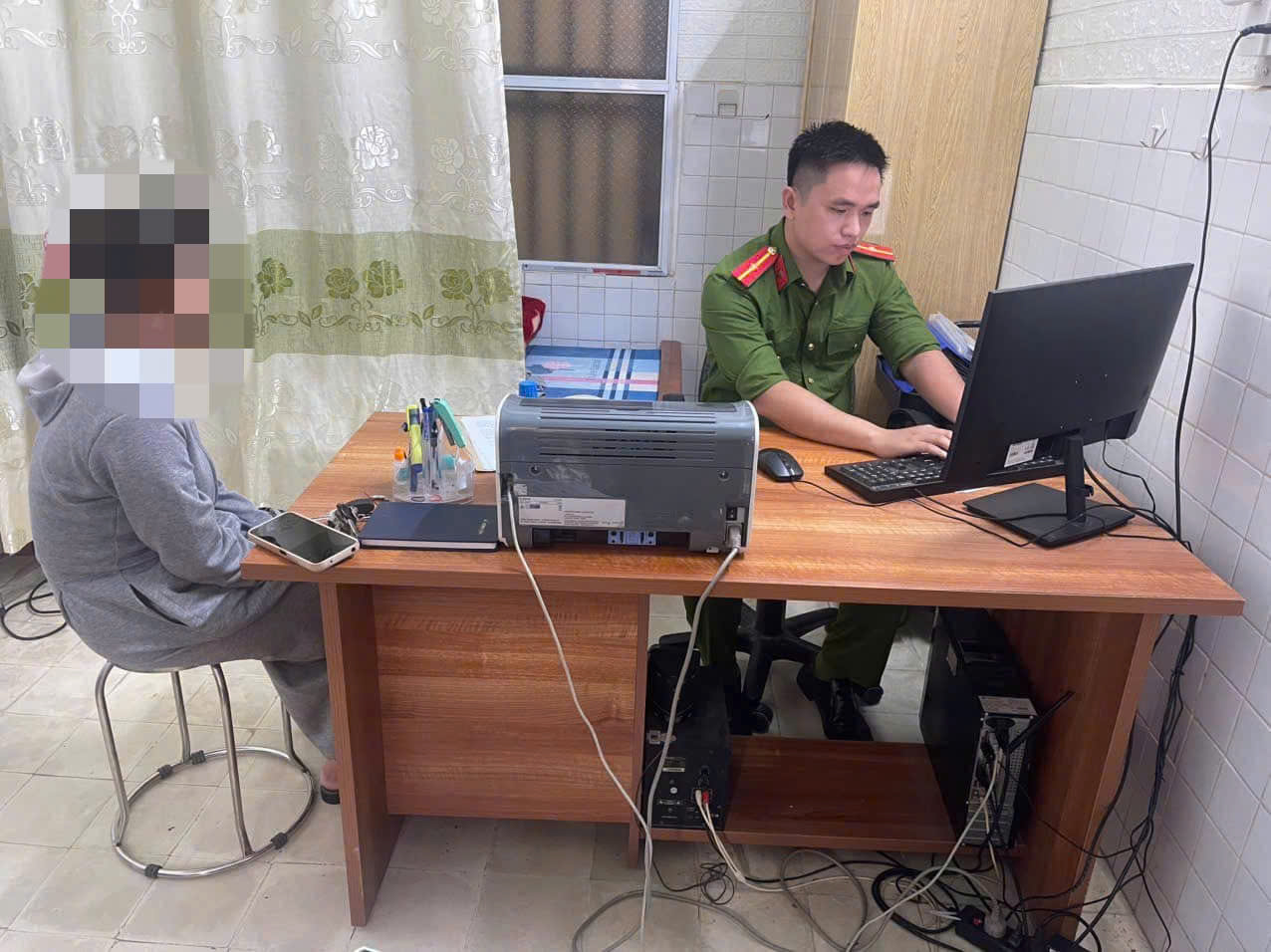 Cán bộ Công an xã làm việc với đối tượng có hành vi đăng tin tin xấu, độc trên không gian mạng.
