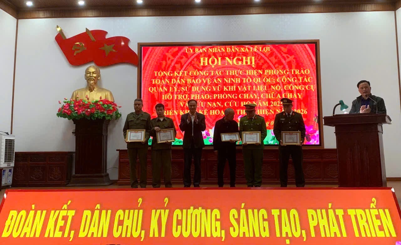 Nhân dịp này, đồng chí Phan Văn Dương, Bí thư Đảng ủy trao giấy khen cho Cán bộ và nhân dân xã Lê Lợi có thành tích xuất sắc trong phong trào Bảo vệ an ninh Tổ quốc. Chủ tịch UBND xã Lê Lợi khen thưởng 10 tập thể và cá nhân có thành tích xuất sắc trong phong trào Toàn dân bảo vệ an ninh Tổ quốc, công tác quản lý nhà nước về an ninh trật tự năm 2025.