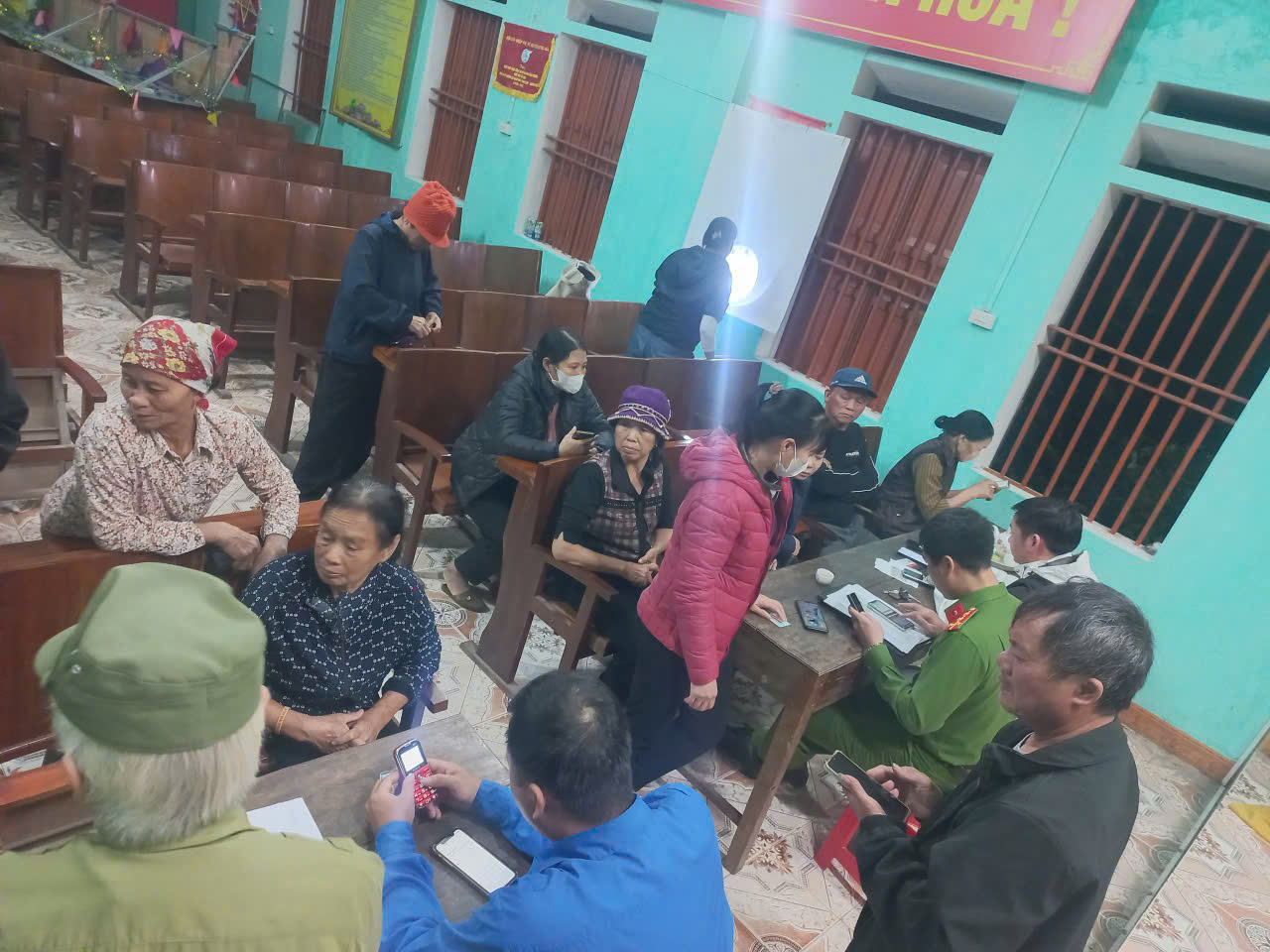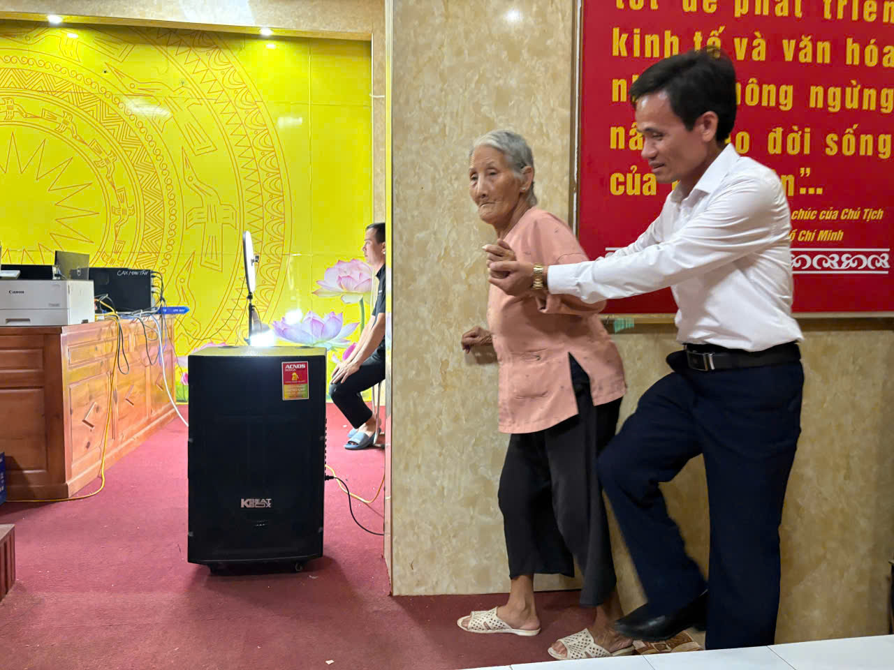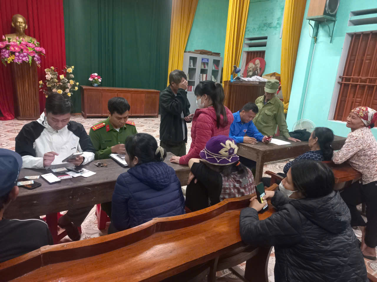 Công an xã phối hợp với Đoàn thanh niên đến hội trường các thôn, làng hỗ trợ người dân kích hoạt tài khoản định danh điện tử mức 2
