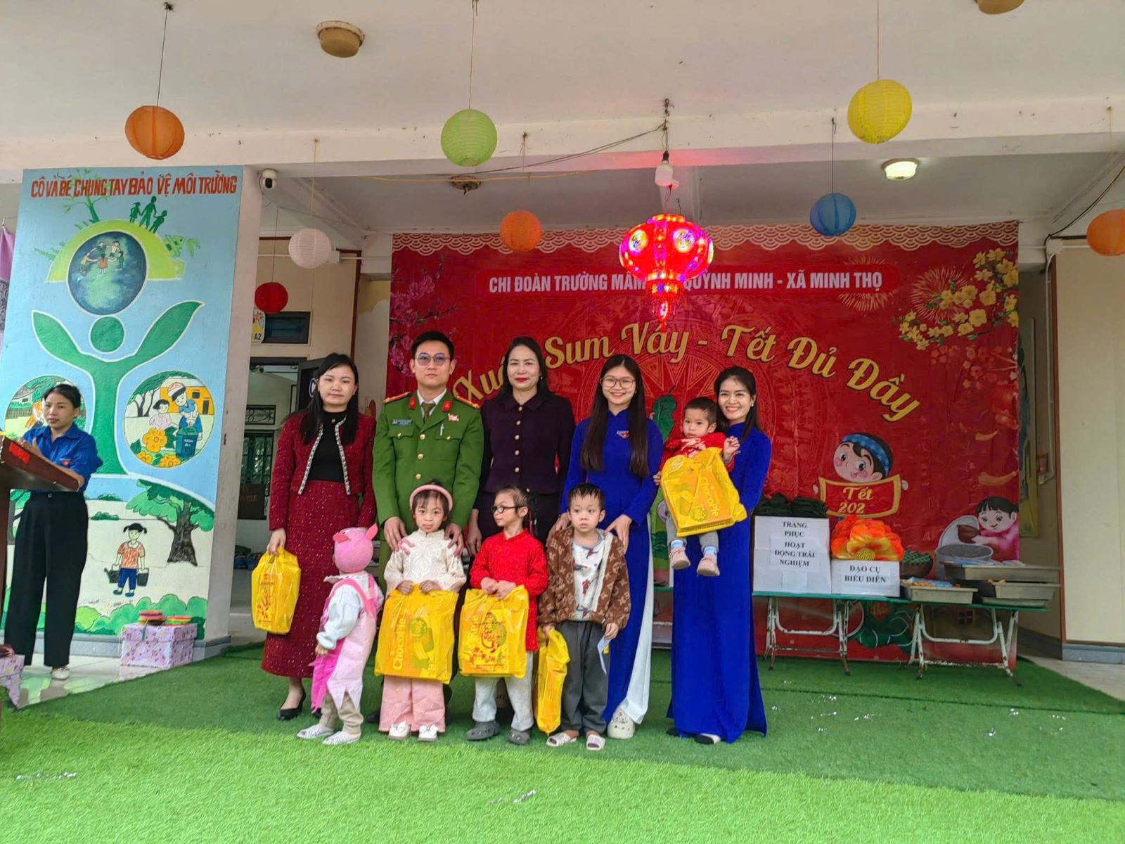 Tại chương trình, Công an xã Minh Thọ, Đoàn Thanh niên xã cùng Ban Giám hiệu nhà trường đã trực tiếp đến từng lớp, ân cần thăm hỏi, động viên các cháu nhỏ, đồng thời trao tặng những phần quà tết gồm bánh kẹo, sữa, đồ dùng học tập và một số nhu yếu phẩm cần thiết. Mỗi phần quà tuy không lớn về giá trị vật chất, nhưng chứa đựng trong đó là tình cảm, trách nhiệm và sự quan tâm sâu sắc của lực lượng Công an, tổ chức Đoàn và chính quyền địa phương đối với thế hệ mầm non của xã nhà.
