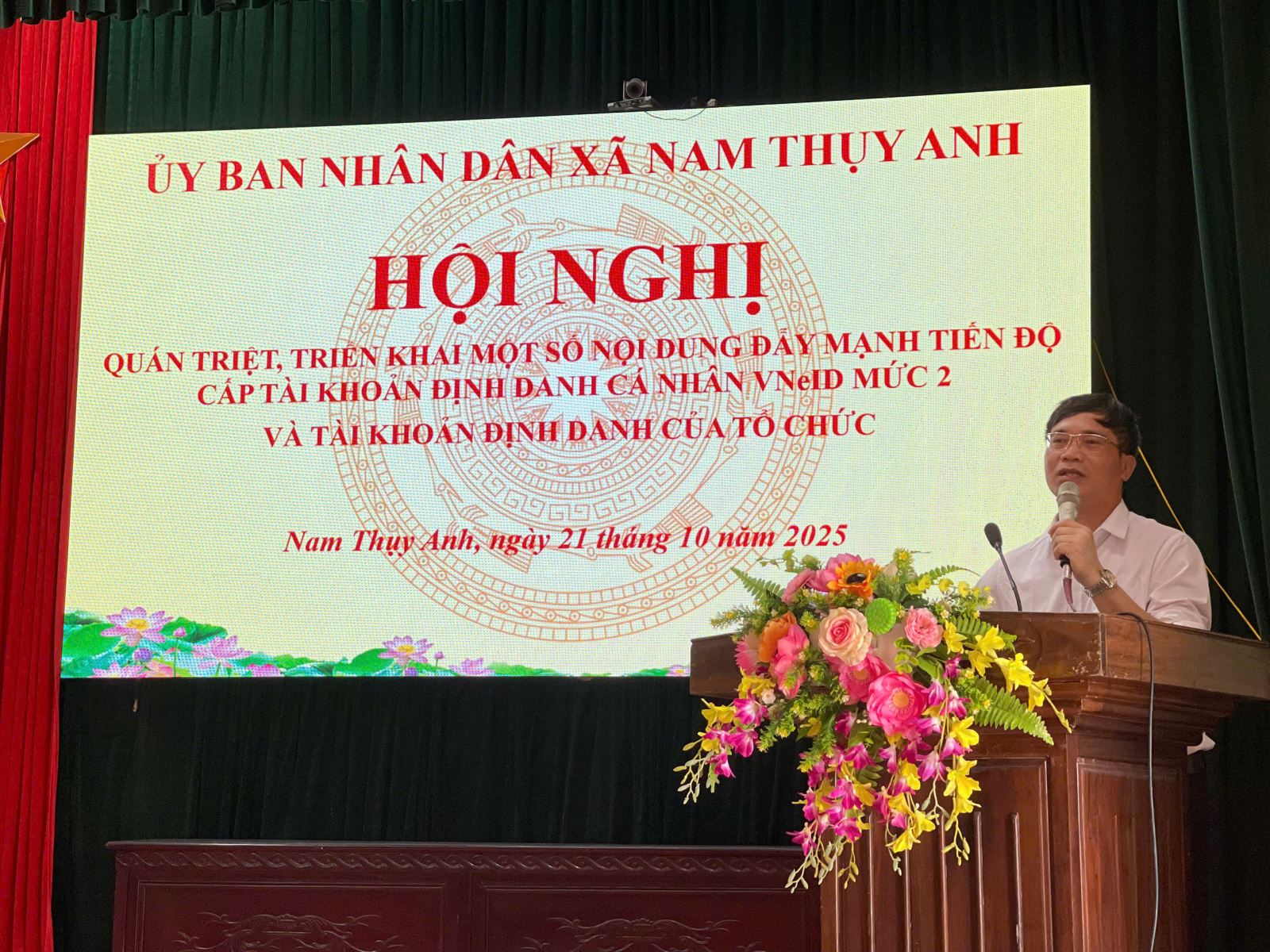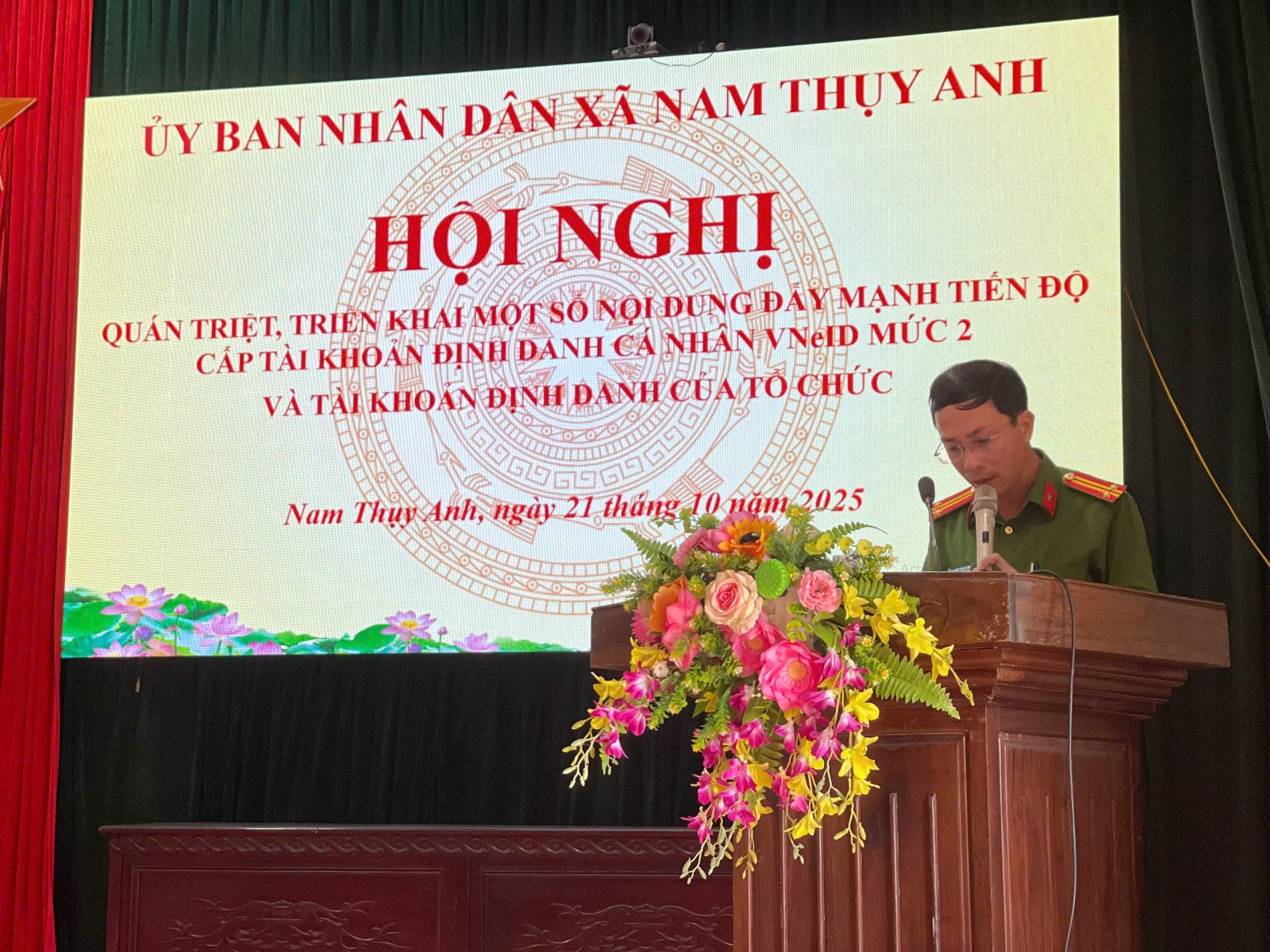Ngày 21/10/2025, UBND xã Nam Thụy Anh tổ chức hội nghị quán triệt, triển khai một số nội dung đẩy nhanh tiến độ cấp tài khoản định danh cá nhân VNeID mức 2 và tài khoản định danh tổ chức. Tham dự hội nghị có các đồng chí đại diện thường trực UBND xã; lãnh đạo Văn phòng HĐND-UBND xã; chỉ huy và cán bộ chiến sĩ Công an xã; lãnh đạo và chuyên viên phòng văn hóa xã hội; hiệu trưởng các trường học; trưởng đài truyền thanh xã; các đồng chí Bí thư chi bộ, trưởng thôn; toàn thể lực lượng ANTT cơ sở trên địa bàn.
