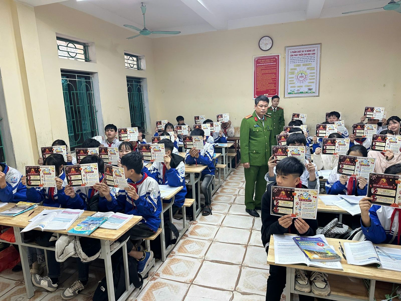 Cán bộ Công an xã Ngự Thiên kiểm tra, phát tờ rơi tuyên truyền phòng, chống pháo nổ và quản lý vũ khí cho các em học sinh Trường THCS Cộng Hòa.