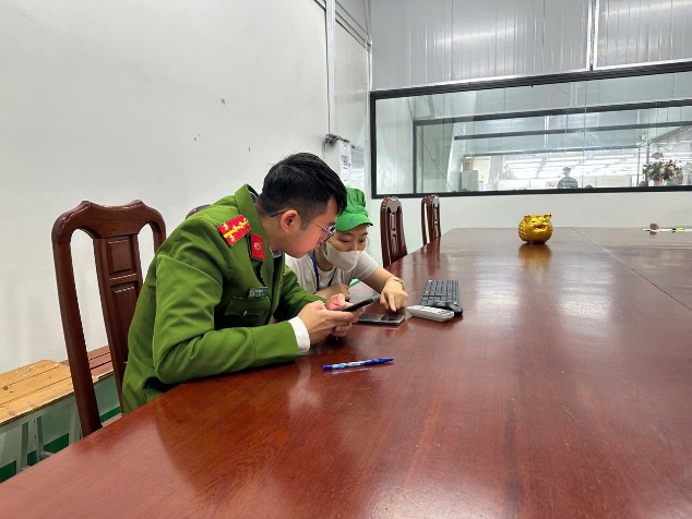 Cán bộ Công an xã Nguyễn Du trực tiếp thao tác, hướng dẫn người lao động sử dụng ứng dụng VNeID tại nơi làm việc