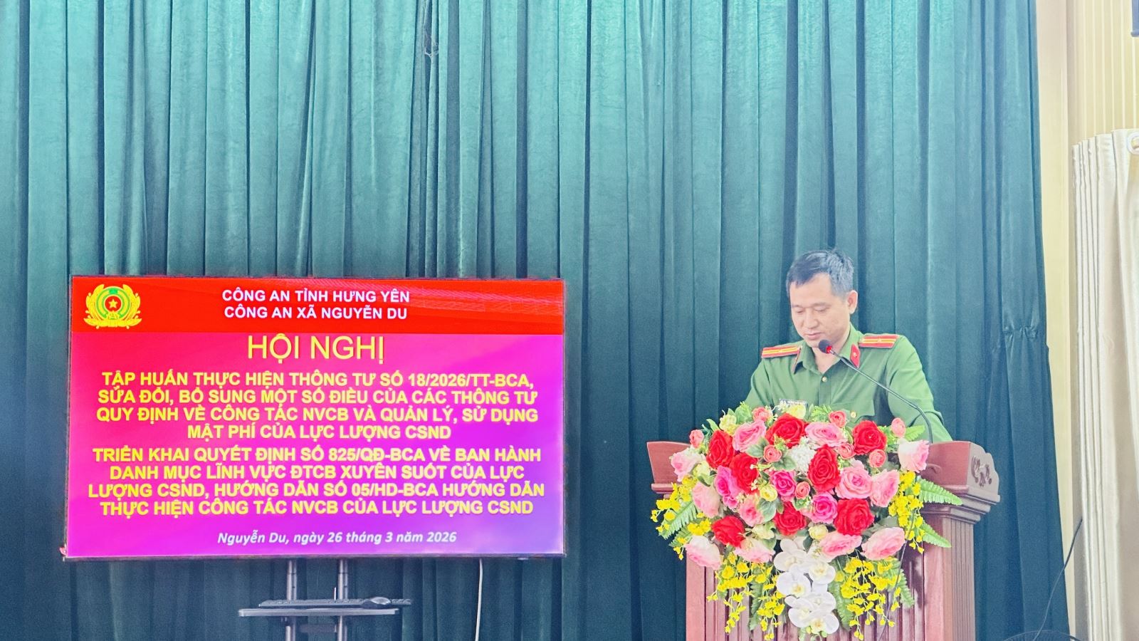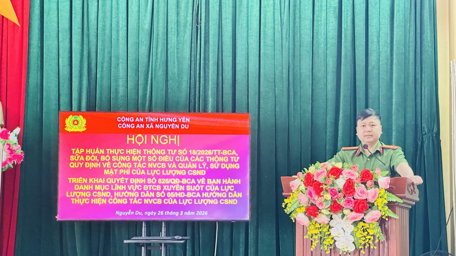 Thực hiện ý kiến chỉ đạo của Lãnh đạo Công an tỉnh Hưng Yên, nhằm nâng cao chất lượng, hiệu quả công tác nắm tình hình, quản lý địa bàn và đấu tranh phòng, chống tội phạm trong tình hình mới, ngày 26/3/2026, Công an xã Nguyễn Du đã tổ chức hội nghị hướng dẫn các quy định mới về công tác nghiệp vụ cơ bản của lực lượng Cảnh sát nhân dân cho toàn thể cán bộ, chiến sĩ trong đơn vị.