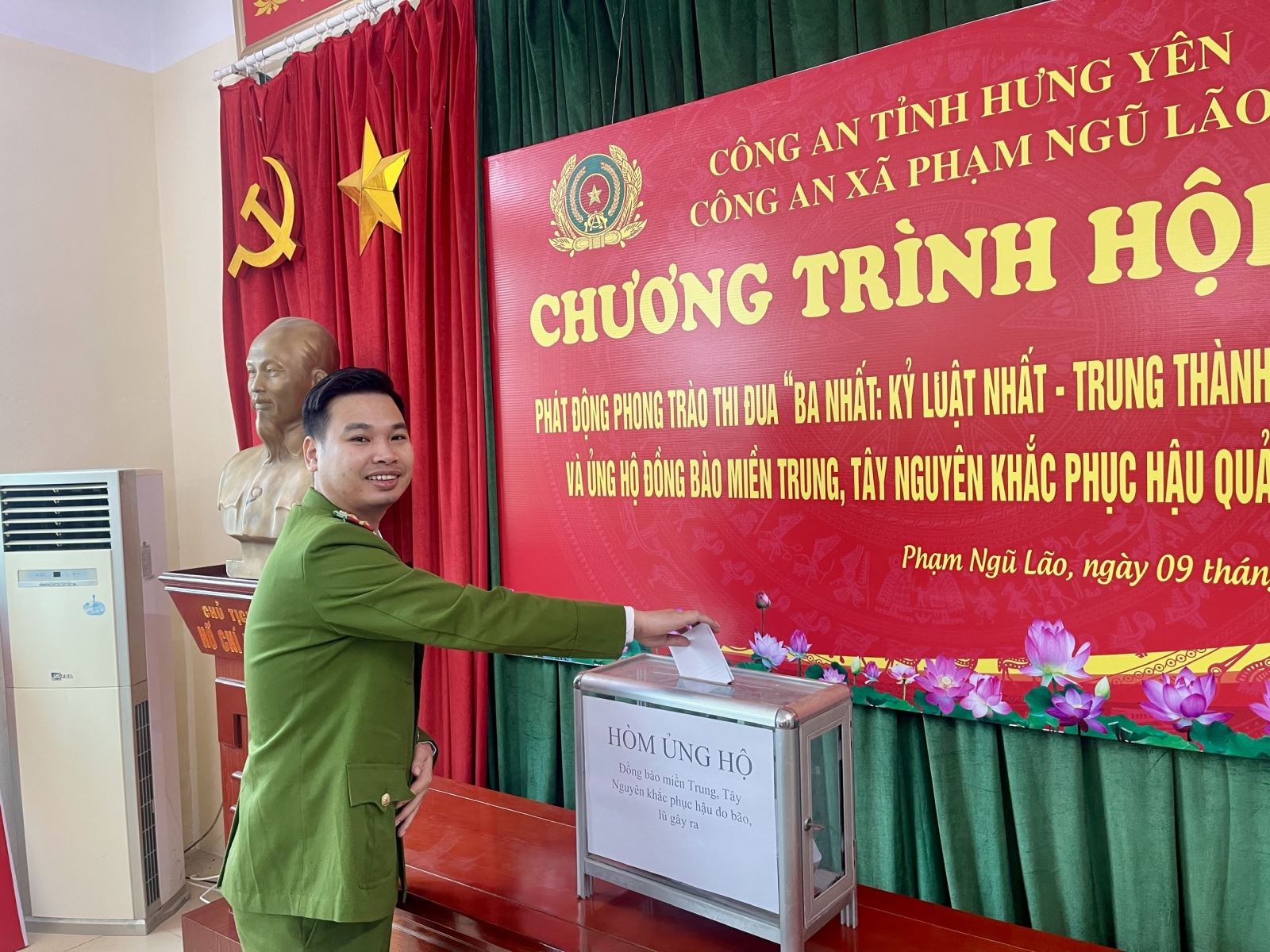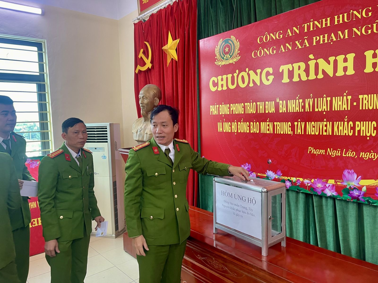 Để mở đầu phong trào thi đua Đồng chí Trưởng Công an xã đại diện cho Đảng ủy, lãnh đạo Công an xã kêu gọi toàn thể cán bộ, chiến sĩ hướng về miền Trung và Tây Nguyên, chung tay ủng hộ đồng bào đang chịu ảnh hưởng thiên tai. Mỗi cán bộ, chiến sĩ tích cực tham gia quyên góp góp phần giúp đồng bào khắc phục hậu quả thiên tai, sớm ổn định cuộc sống và sản xuất, thể hiện tinh thần “tương thân tương ái”, “lá lành đùm lá rách” và truyền thống “vì nước quên thân, vì dân phục vụ” của lực lượng Công an nhân dân.”