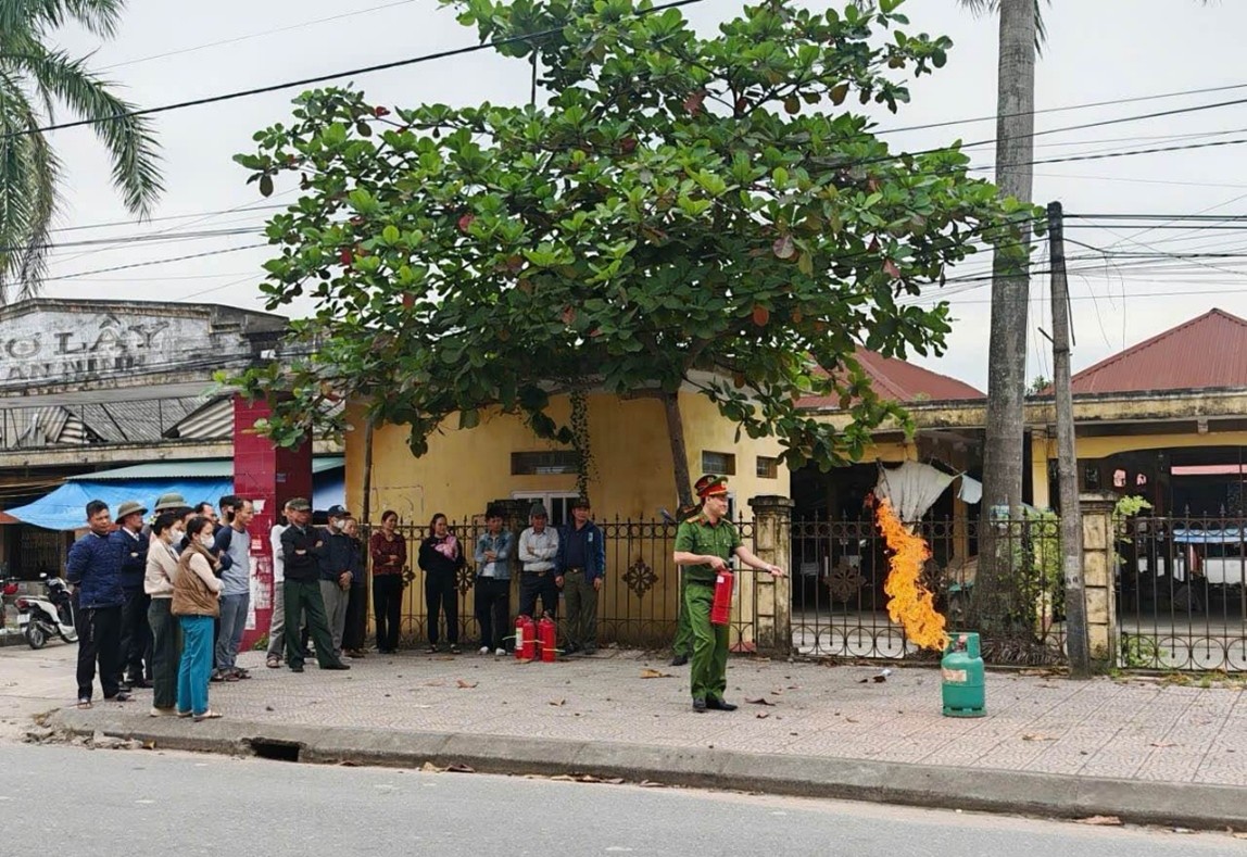 Cán bộ Công an xã trong buổi tuyên truyền và hướng dẫn thực hành sử dụng bình chữa cháy xách tay