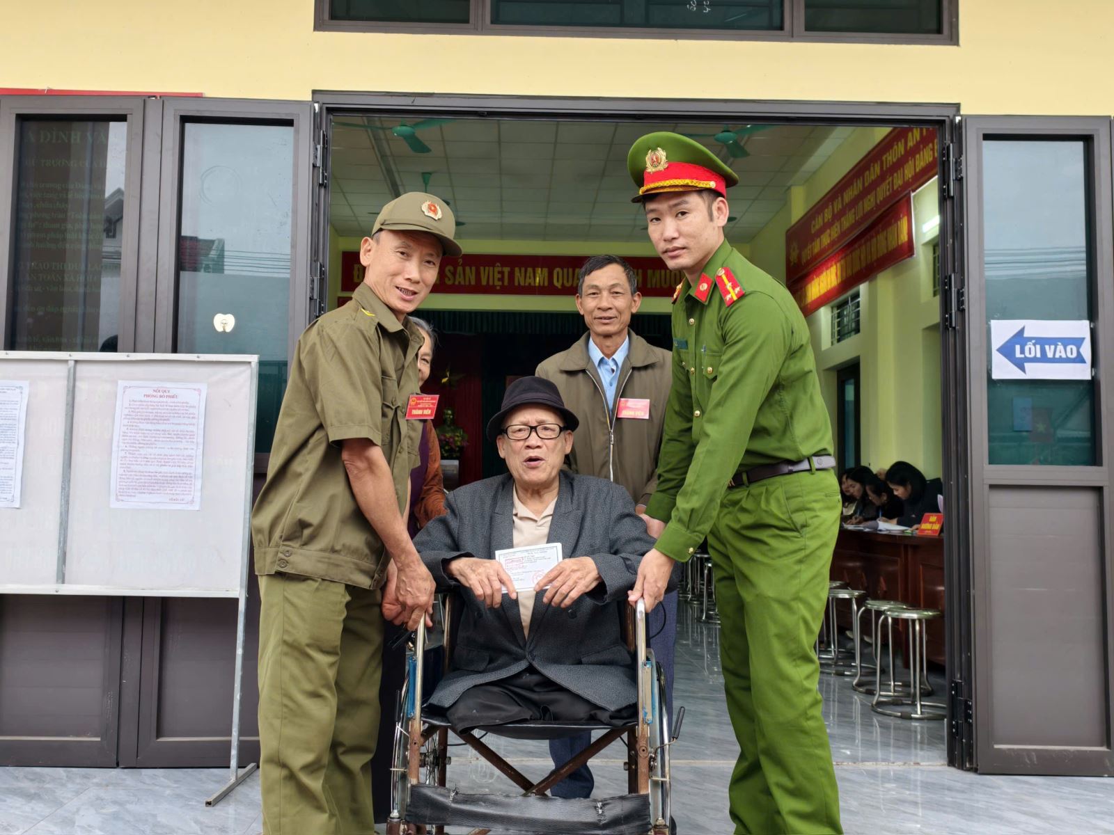 Công an xã Quỳnh Phụ giúp đỡ cử tri là thương binh đến bỏ phiếu