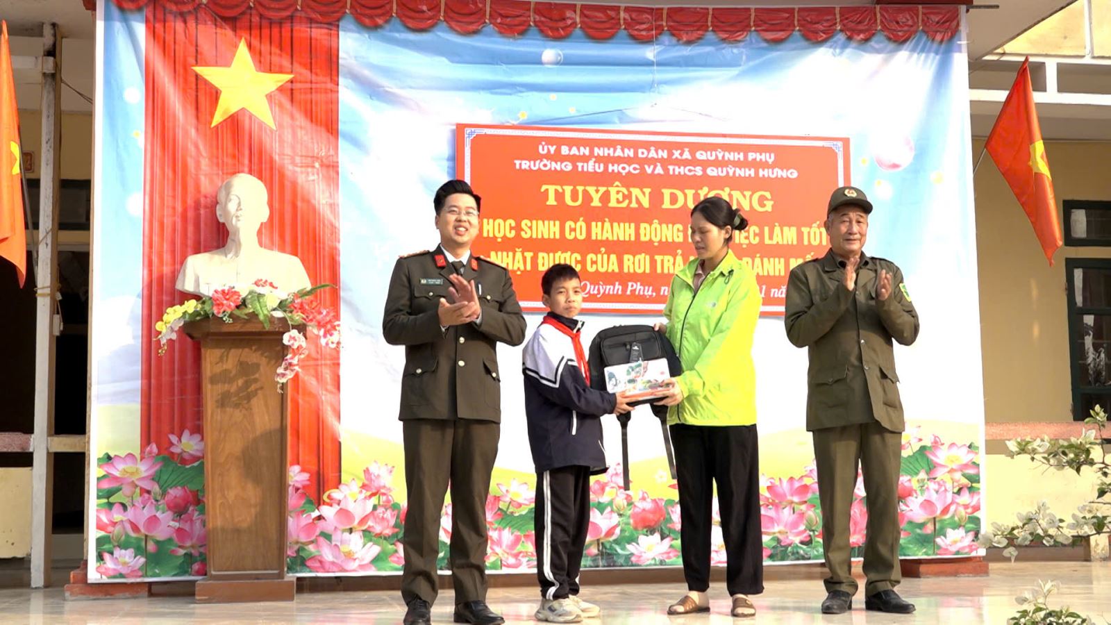 Vào ngày 13/01/2026, trước sự chứng kiến của Công an xã Quỳnh Phụ và Ban giám hiệu trường TH&THCS Quỳnh Hưng, cháu Trần Đức Duy đã bàn giao tài sản nhặt được cho chị Nguyễn Thị Lan. Trong niềm vui và sự xúc động, chị Nguyễn Thị Lan gửi lời cảm ơn chân thành tới cháu Trần Đức Duy đã có nghĩa cử cao đẹp và cảm ơn Công an xã Quỳnh Phụ đã kịp thời hỗ trợ. Nhằm kịp thời động viên, khích lệ nghĩa cử cao đẹp nhặt được của rơi, trả người đánh mất, Công an xã Quỳnh Phụ đã phối hợp với trường TH & THCS Quỳnh Hưng tổ chức chương trình tuyên dương gương người tốt việc tốt. Tại chương trình, Công an xã Quỳnh Phụ trao thư khen của đồng chí Trưởng Công an xã cho cháu Trần Đức Duy đồng thời tổ chức tuyên truyền, phát động học sinh trong nhà trường tiếp nối truyền thống tốt đẹp, tích cực tham gia xây dựng môi trường học đường văn minh, an toàn về an ninh trật tự.