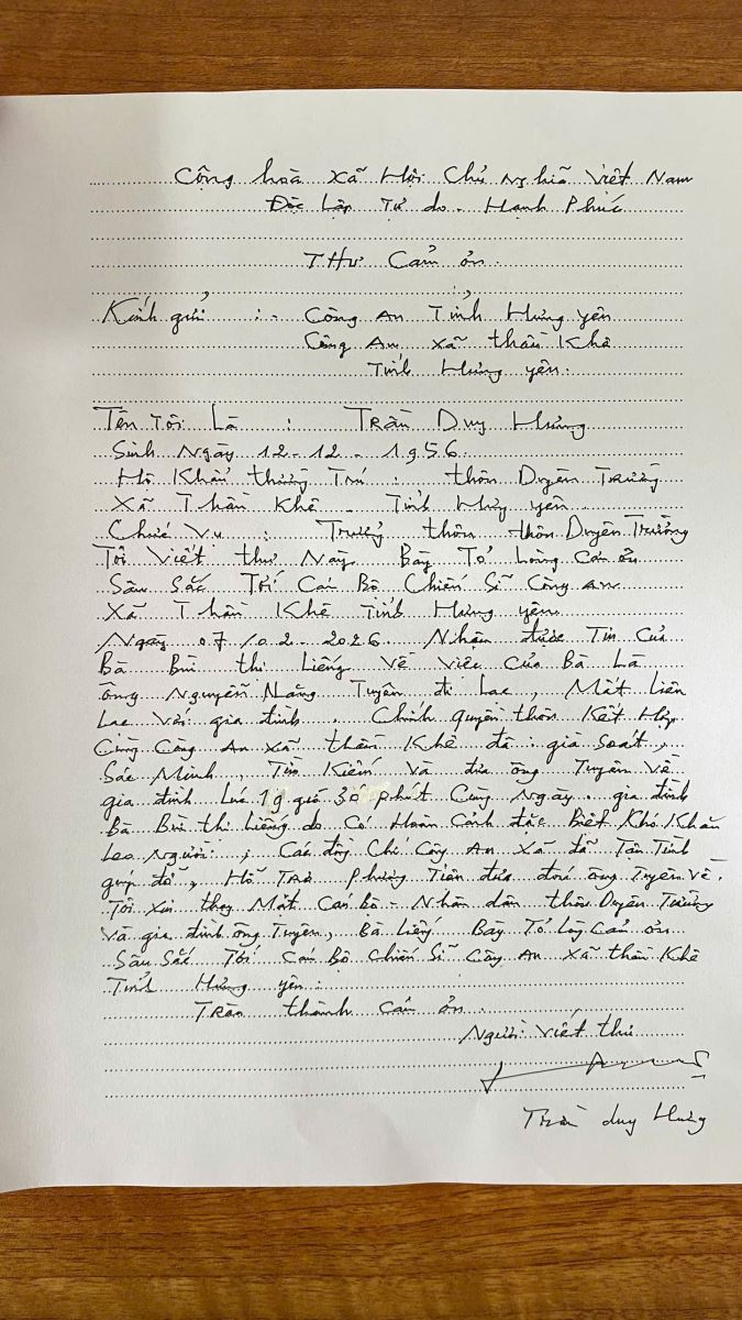 Thư cảm ơn Công an xã Thần Khê của gia đình