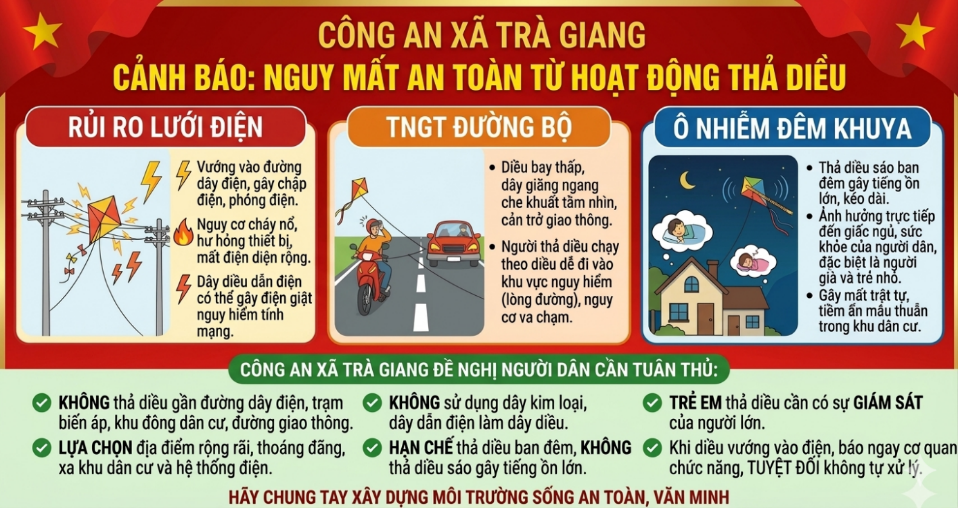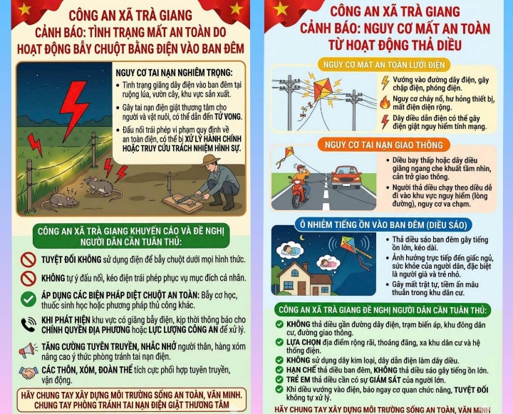 Thời gian gần đây, trên địa bàn xã Trà Giang xuất hiện một số hoạt động tiềm ẩn nguy cơ mất an toàn, ảnh hưởng trực tiếp đến tính mạng, sức khỏe và đời sống sinh hoạt của Nhân dân. Đáng chú ý là tình trạng sử dụng điện để bẫy chuột tại khu vực sản xuất nông nghiệp và hoạt động thả diều không đúng quy định, đặc biệt vào ban đêm. Trước thực tế trên, Công an xã Trà Giang khuyến cáo người dân nâng cao ý thức phòng ngừa, chấp hành nghiêm các quy định của pháp luật nhằm đảm bảo an ninh, trật tự trên địa bàn.