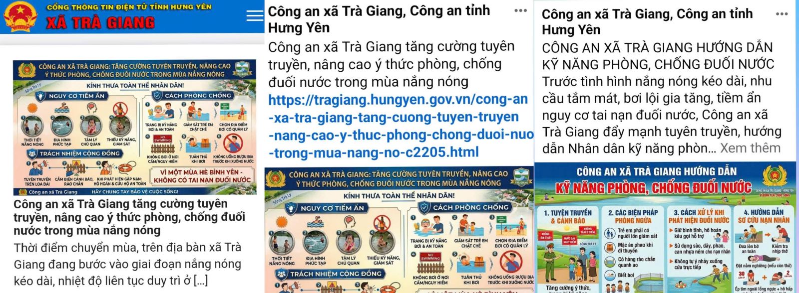 Trà Giang là địa bàn có hệ thống sông, ao, hồ phân bố dày đặc, đặc biệt có sông Trà Lý chảy qua, tiềm ẩn nhiều nguy cơ mất an toàn, nhất là tai nạn đuối nước. Trên cơ sở nhận diện rõ những yếu tố rủi ro đó, Công an xã Trà Giang đã chủ động triển khai đồng bộ các giải pháp phòng ngừa, trong đó chú trọng đẩy mạnh công tác tuyên truyền, nâng cao nhận thức và ý thức phòng, chống đuối nước trong Nhân dân. Công an xã đã chủ động tham mưu cấp ủy, chính quyền địa phương tăng cường các biện pháp phòng ngừa, trong đó lấy công tác tuyên truyền làm trọng tâm. Thời gian qua, lực lượng Công an xã đã triển khai đa dạng các hình thức tuyên truyền, bảo đảm phù hợp với từng nhóm đối tượng. Nhiều tin, bài cảnh báo, hướng dẫn kỹ năng phòng, chống đuối nước được đăng tải thường xuyên trên Cổng thông tin điện tử của UBND xã và trang mạng xã hội của Công an xã, thu hút sự quan tâm, theo dõi của đông đảo người dân. Đồng thời, nội dung tuyên truyền cũng được phát sóng định kỳ trên hệ thống truyền thanh cơ sở, giúp thông tin đến gần hơn với các hộ gia đình.