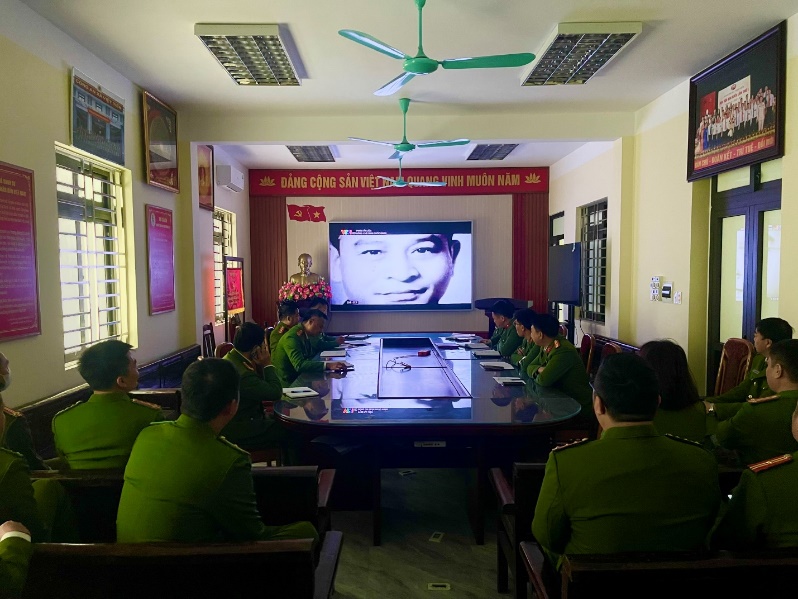 Cán bộ, chiến sĩ Công an xã xem phim tư liệu về đồng chí Trần Quốc Hoàn
