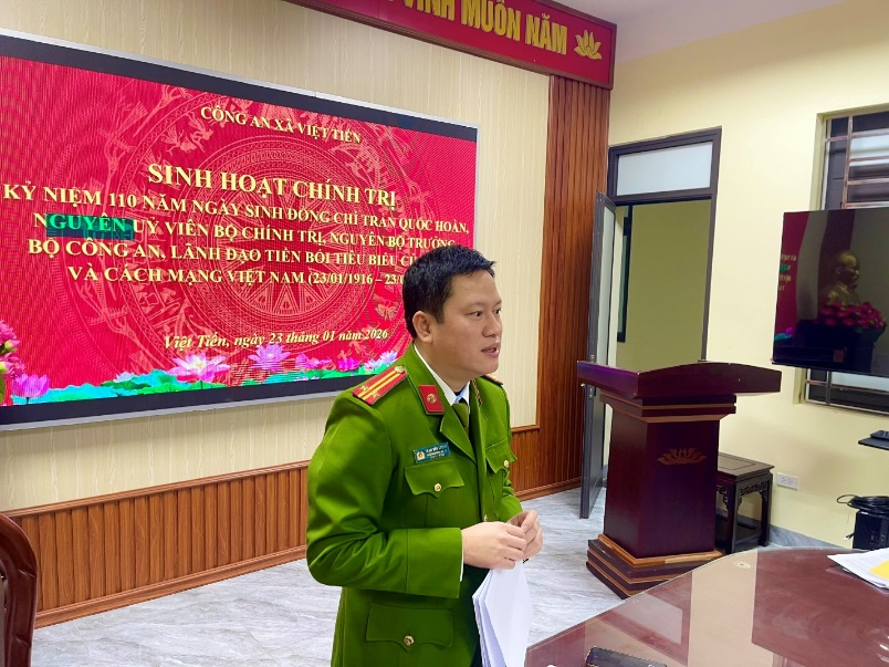 Nhân dịp kỷ niệm 110 năm Ngày sinh đồng chí Trần Quốc Hoàn, nguyên Uỷ viên Bộ Chính trị, nguyên Bộ trưởng Bộ Công an, lãnh đạo tiền bối tiêu biểu của Đảng và cách mạng Việt Nam (23/01/1916 - 23/01/2026); ngày 23/01/2026, Công an xã Việt Tiến tổ chức buổi sinh hoạt chính trị với nội dung xem phim tư liệu về cuộc đời, sự nghiệp cách mạng của đồng chí Trần Quốc Hoàn - Người có nhiều đóng góp đặc biệt quan trọng đối với sự nghiệp cách mạng của Đảng, của dân tộc và sự trưởng thành, lớn mạnh của lực lượng Công an nhân dân (CAND).