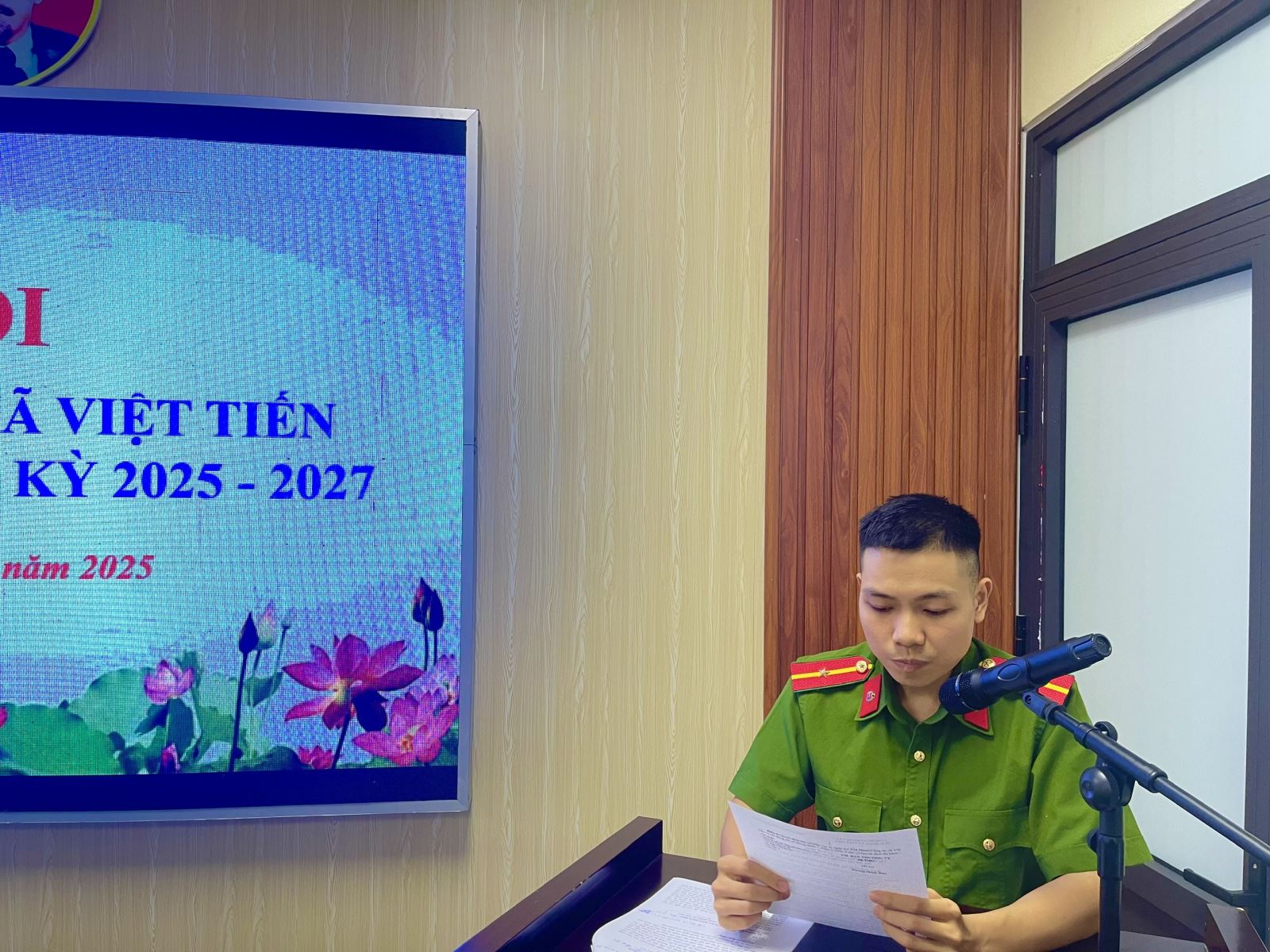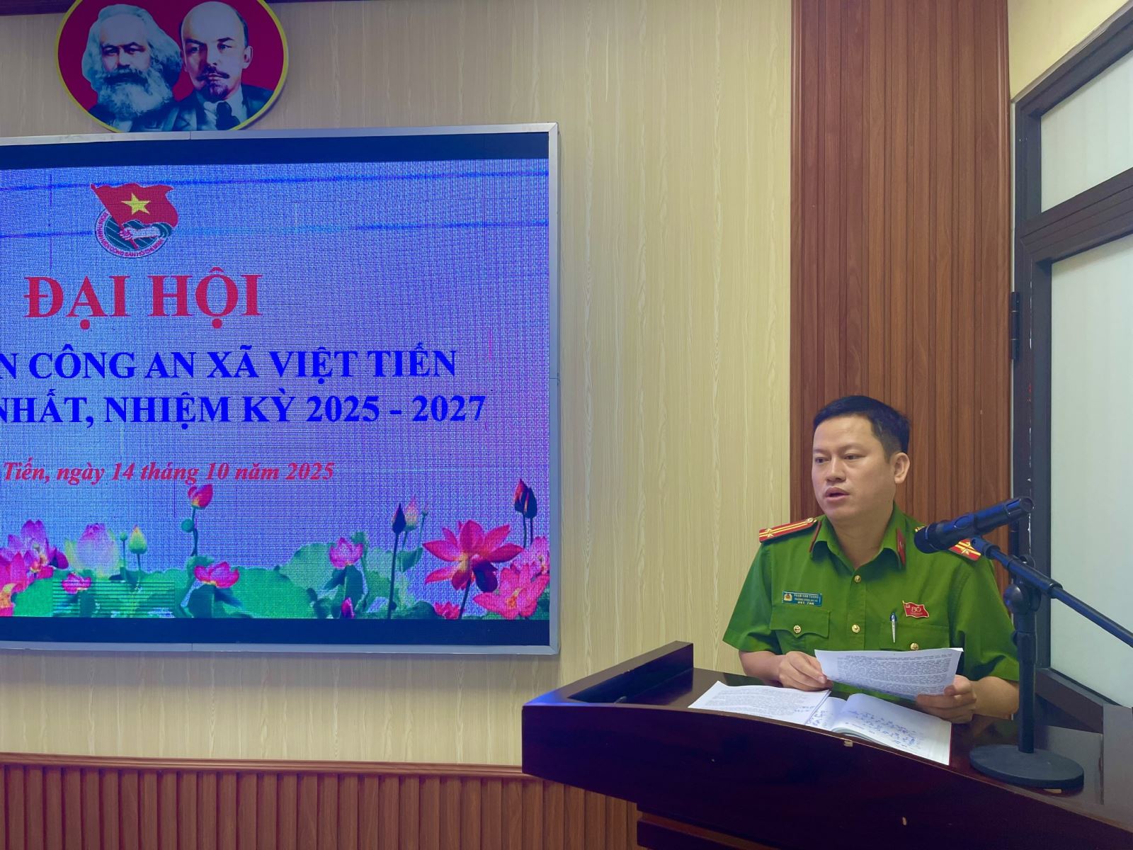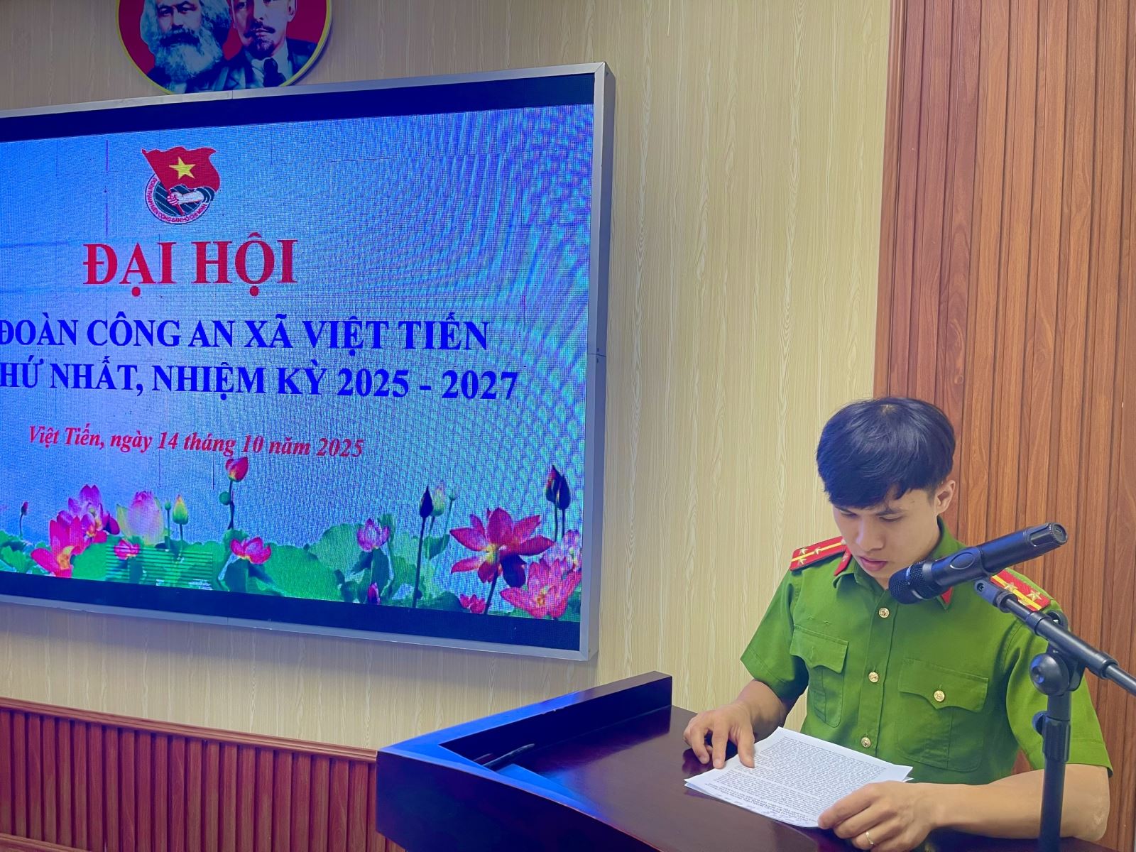 Ngày 14/10/2025, Chi đoàn Công an xã Việt Tiến tổ chức Đại hội Chi đoàn nhiệm kỳ 2025 - 2027. Đây là sự kiện chính trị quan trọng, nhằm tổng kết công tác Đoàn và phong trào thanh niên trong nhiệm kỳ qua, đồng thời đề ra phương hướng hoạt động cho nhiệm kỳ mới.