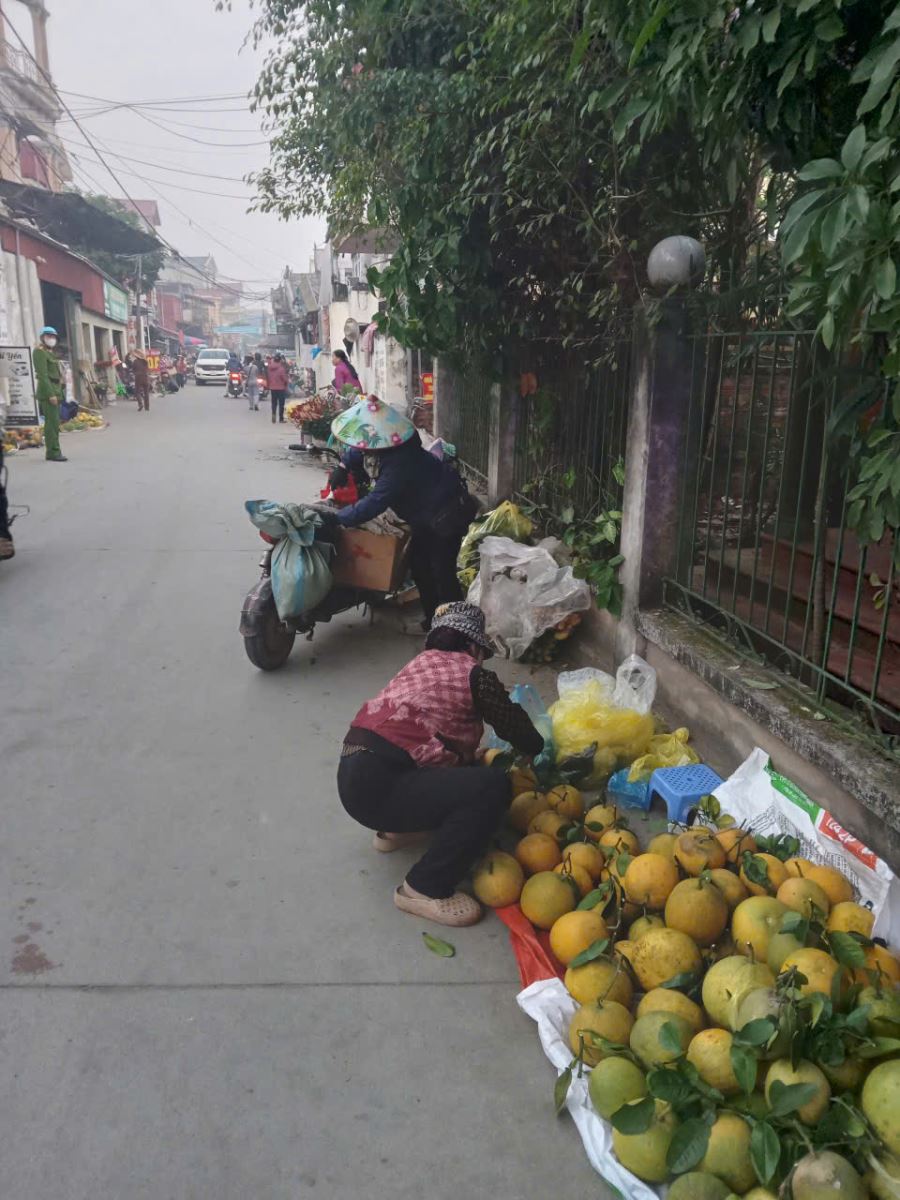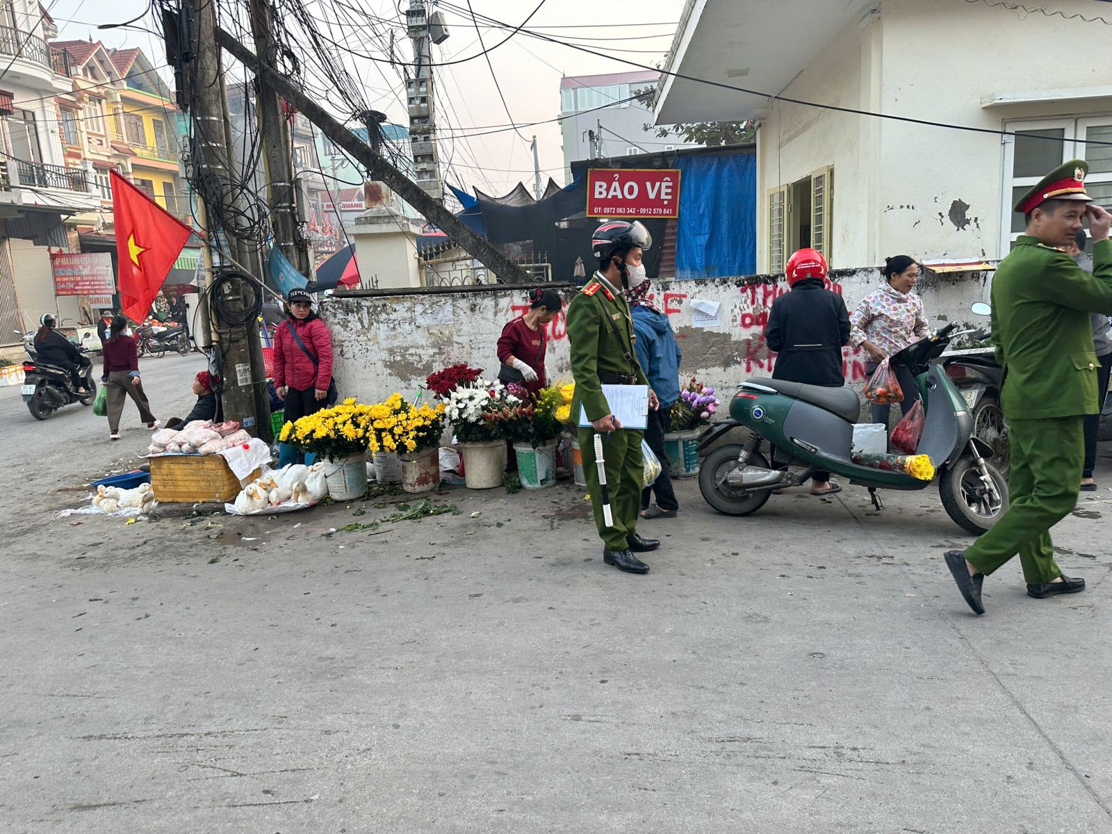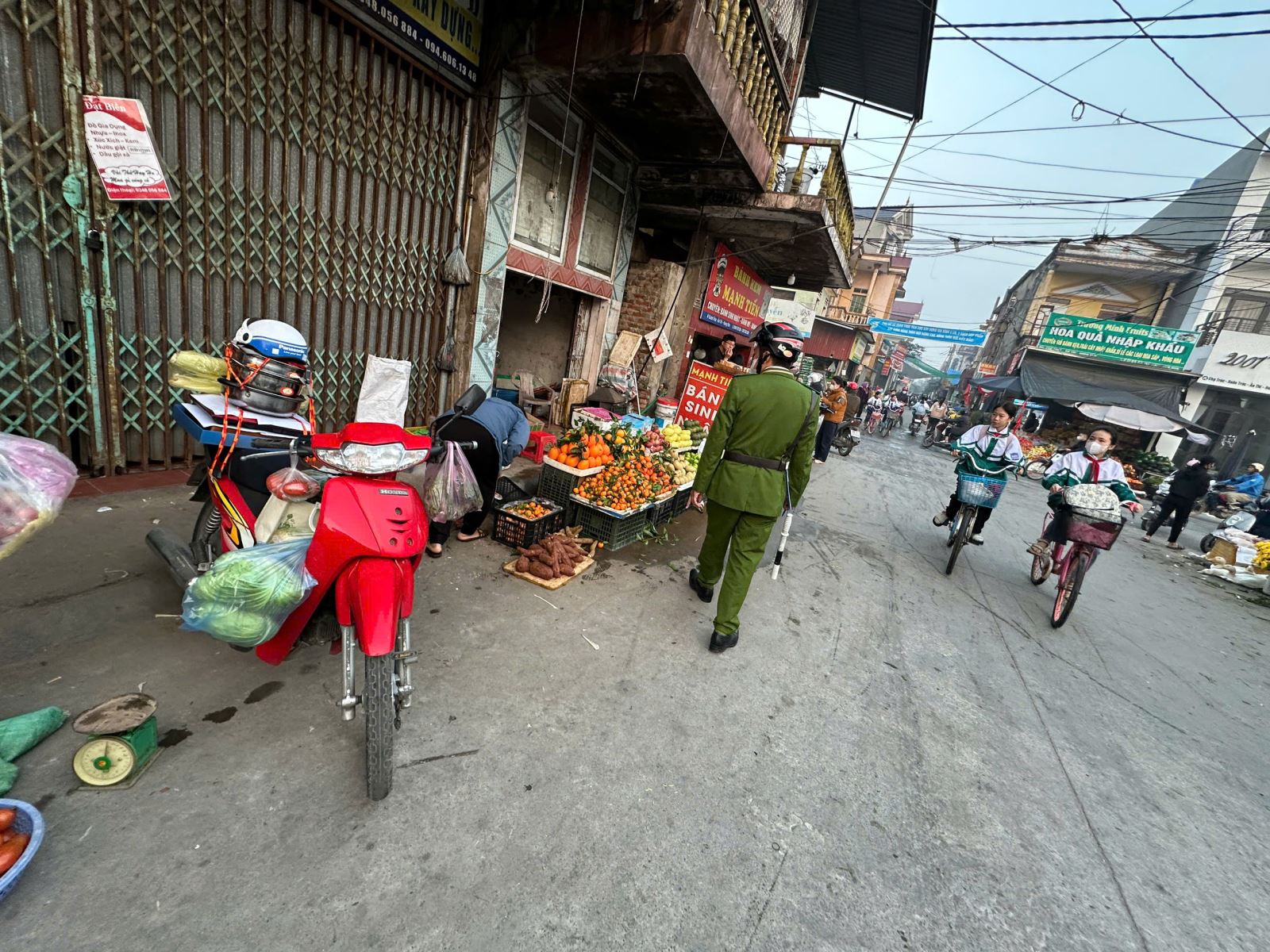 Lực lượng Công an xã tuần tra, kiểm tra tình trạng bày bán hàng hóa lấn chiếm lòng đường tại khu vực chợ trên địa bàn xã Xuân Trúc.