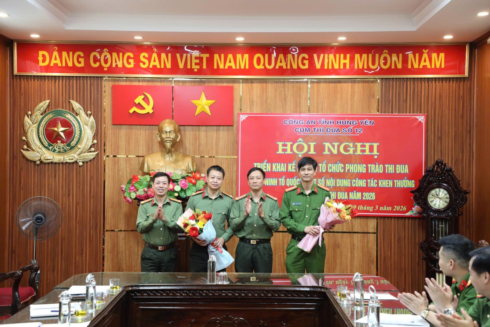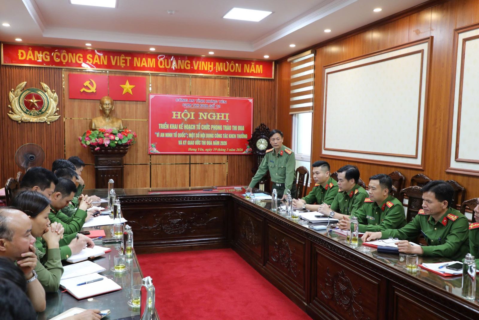 Chiều ngày 19/3/2026 tại Phòng họp số 1, trụ sở số 2 Công an tỉnh Hưng Yên, Công an xã Thư Vũ (đơn vị Cụm trưởng cụm thi đua số 12) chủ trì tổ chức Hội nghị triển khai kế hoạch thực hiện Phong trào thi đua “Vì an ninh Tổ quốc” và ký giao ước thi đua năm 2026 của Cụm thi đua số 12. Đồng chí Thượng tá Trần Văn Kiên - Trưởng phòng Công tác chính trị; đồng chí Thượng tá Nguyễn Trung Son – Phó trưởng phòng Tổ chức cán bộ thừa uỷ quyền của Lãnh đạo Công an tỉnh dự và chỉ đạo hội nghị.