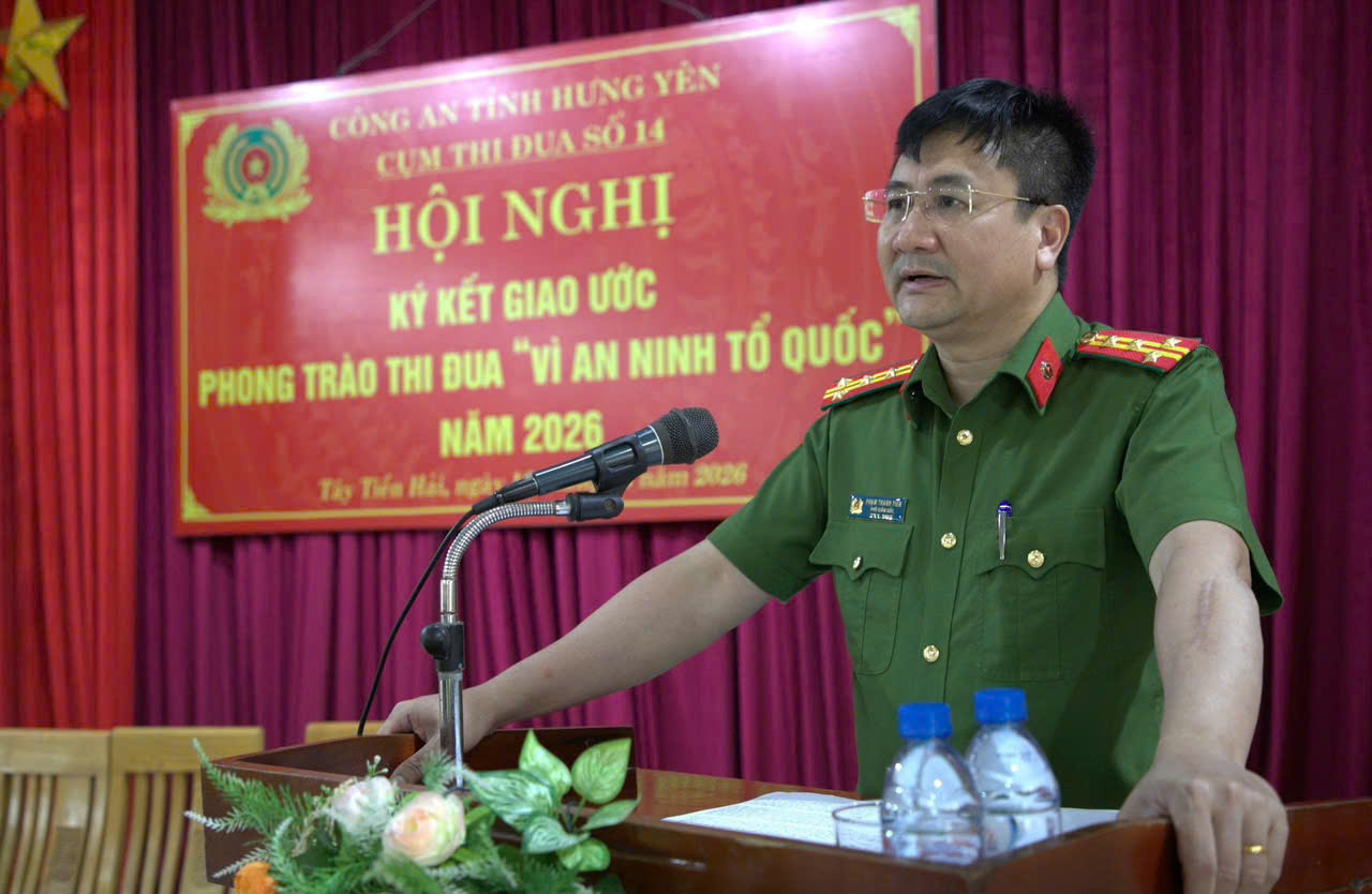 Thay mặt Cụm thi đua số 14, đồng chí Thượng tá Nguyễn Văn Duy – Trưởng Công an xã Tây Tiền Hải, Cụm trưởng thi đua đã quán triệt, triển khai các nội dung trọng tâm của phong trào thi đua năm 2026. Theo đó, các đơn vị trong Cụm, đẩy mạnh thực hiện phong trào thi đua “Ba nhất” do Bộ Công an phát động, cụ thể hóa thành các tiêu chí đánh giá mức độ hoàn thành của các đơn vị trong cụm. Gắn phong trào thi đua với thực hiện nhiệm vụ chính trị của từng đơn vị; chú trọng nâng cao chất lượng công tác xây dựng phong trào toàn dân bảo vệ an ninh Tổ quốc; tăng cường công tác phòng ngừa, đấu tranh với các loại tội phạm và vi phạm pháp luật; siết chặt kỷ luật, kỷ cương, nâng cao tinh thần trách nhiệm của cán bộ, chiến sĩ; tích cực ứng dụng khoa học công nghệ, chuyển đổi số trong các mặt công tác… Các đại biểu đã thảo luận, thống nhất các nhiệm vụ, giải pháp nhằm nâng cao hiệu quả các mặt công tác Công an, góp phần bảo đảm an ninh chính trị, trật tự an toàn xã hội trên địa bàn.