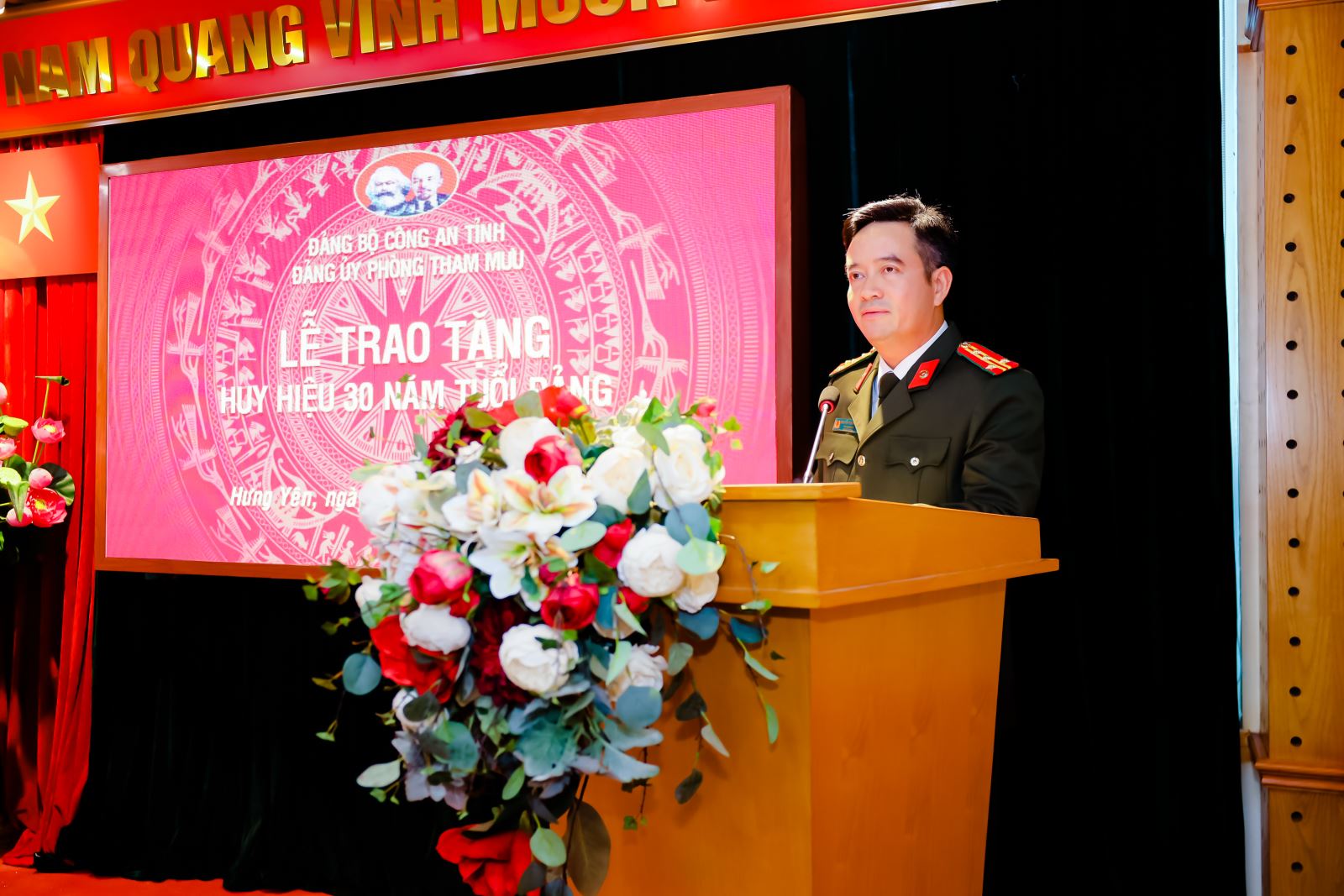 Phát biểu tại buổi lễ, đồng chí Đại tá Nguyễn Thành Sơn, Phó Bí thư Đảng ủy, Phó Giám đốc Công an tỉnh nhấn mạnh: “Huy hiệu 30 năm tuổi Đảng là phần thưởng cao quý của Đảng dành tặng cho những đảng viên đã có quá trình rèn luyện, cống hiến và trưởng thành trong suốt nhiều năm công tác. Đây không chỉ là niềm vinh dự của cá nhân, mà còn là niềm tự hào chung của toàn Đảng bộ Công an tỉnh”. Đồng thời, đồng chí ghi nhận và biểu dương những đóng góp quan trọng của đồng chí Thượng tá Trần Đăng Thuấn trong quá trình công tác, luôn giữ vững phẩm chất người chiến sĩ Công an nhân dân, kiên định lập trường tư tưởng, gương mẫu trong lối sống và hoàn thành tốt mọi nhiệm vụ được giao.