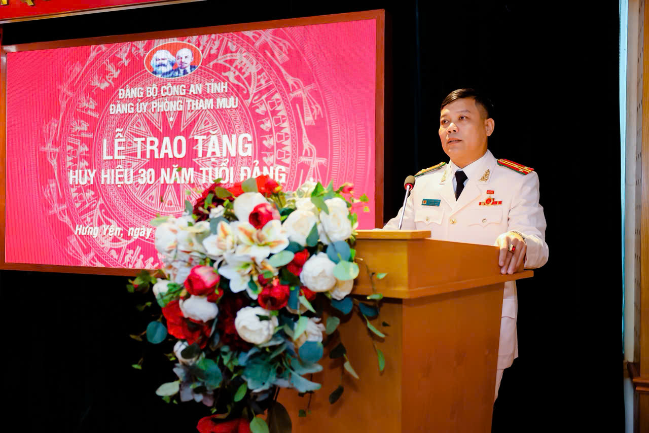 Chiều ngày 06/11/2025, tại Hội trường Công an tỉnh Hưng Yên, Đảng ủy Phòng Tham mưu đã long trọng tổ chức Lễ trao tặng Huy hiệu 30 năm tuổi Đảng cho đồng chí Thượng tá Trần Đăng Thuấn, Uỷ viên Ban Chấp hành Đảng uỷ, Phó Trưởng phòng Tham mưu. Tham dự buổi lễ có đồng chí Đại tá Nguyễn Thành Sơn, Phó Bí thư Đảng ủy, Phó Giám đốc Công an tỉnh; các đồng chí trong Ban Thường vụ Đảng ủy, lãnh đạo Phòng Tham mưu, cùng các đồng chí là Bí thư, Phó Bí thư các Chi bộ trực thuộc Đảng bộ Phòng Tham mưu, Đại diện các tổ chức đoàn thể và đơn vị nơi đồng chí sinh hoạt, công tác.